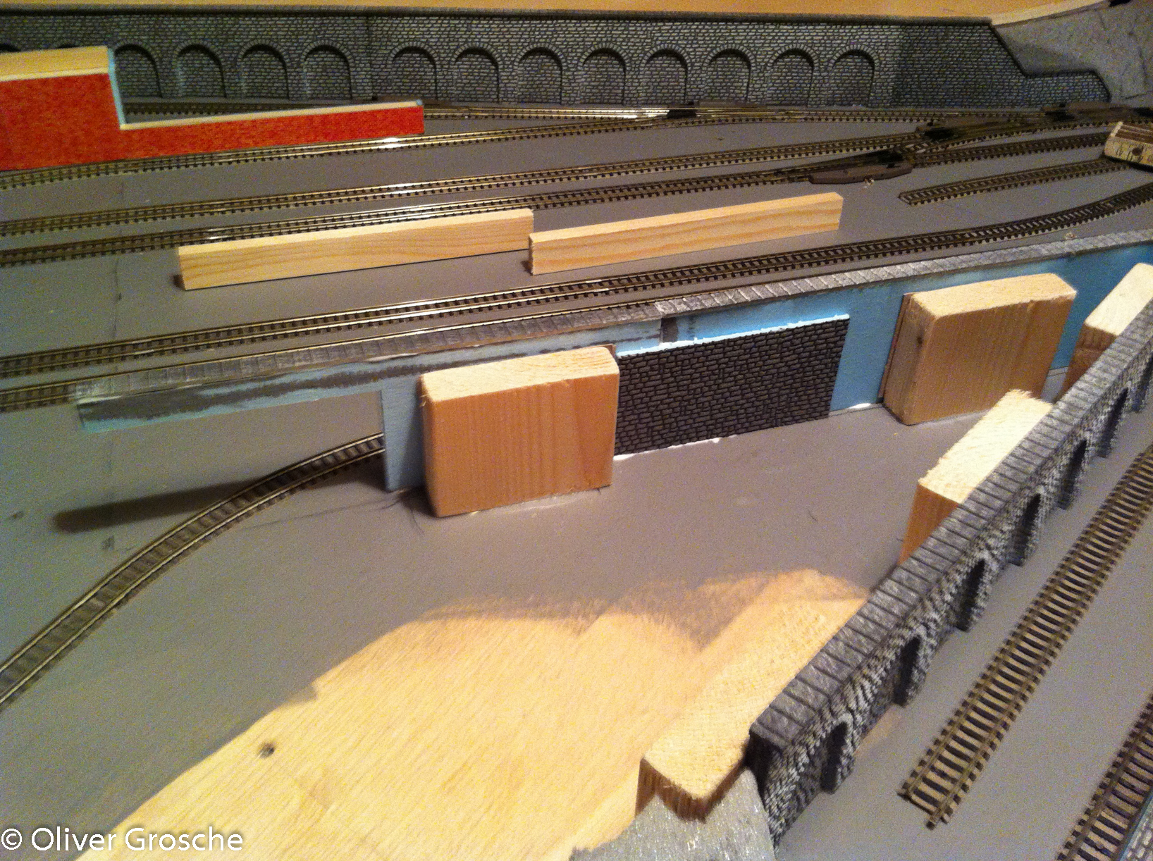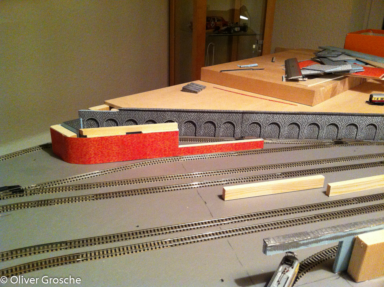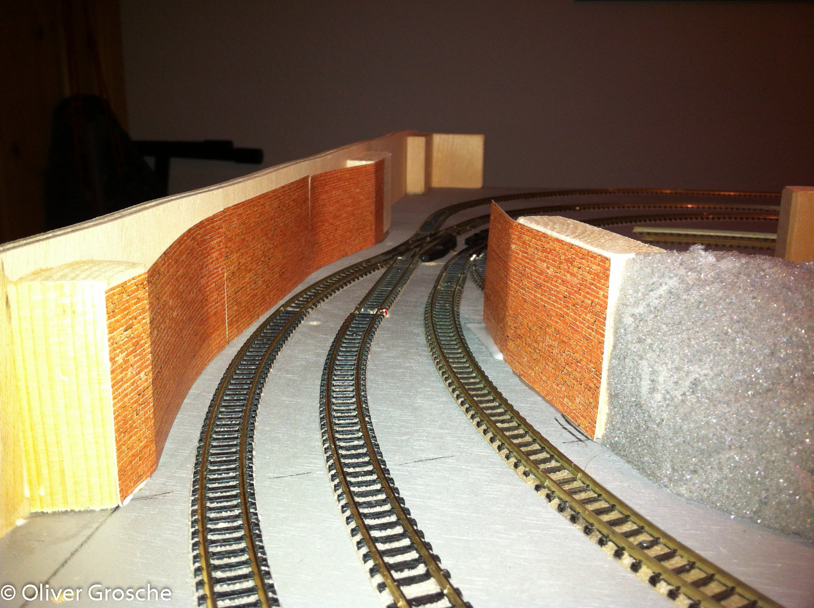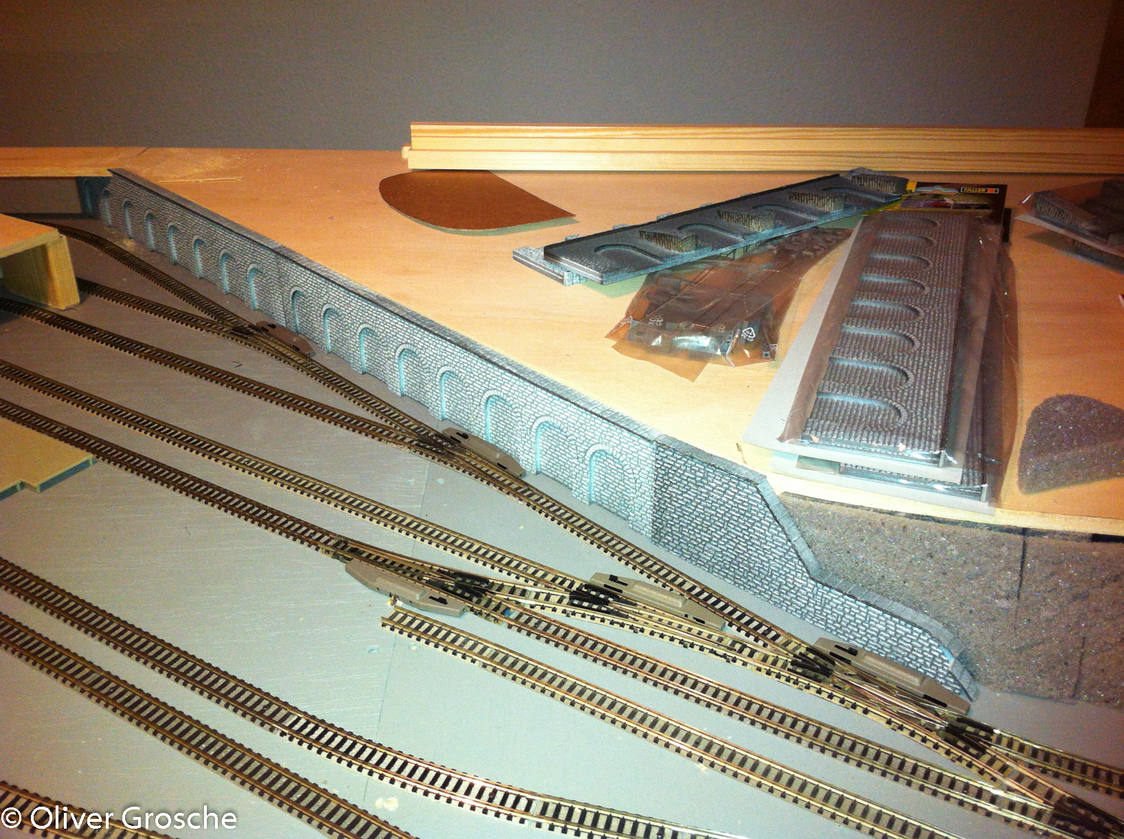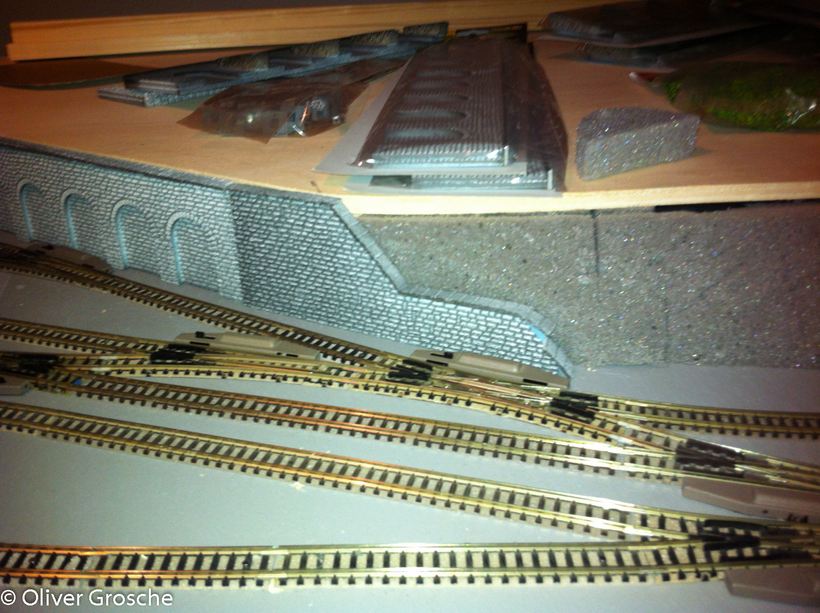 Für eine zukünftige Erweiterung der Anlage (z.B. ein FiddleYard oder so…) habe ich noch eine zusätzliche Weiche im versteckten Bahnhofsbereich eingebaut. Zudem wurden noch Restarbeiten an den Mauern gemacht.