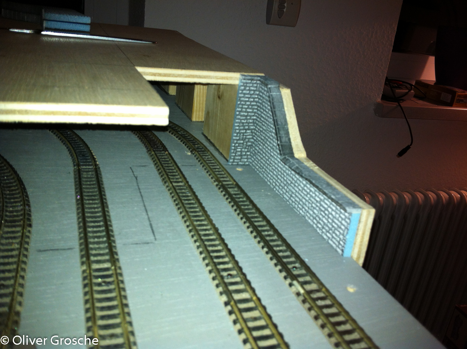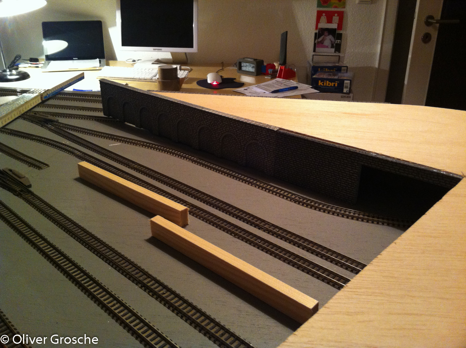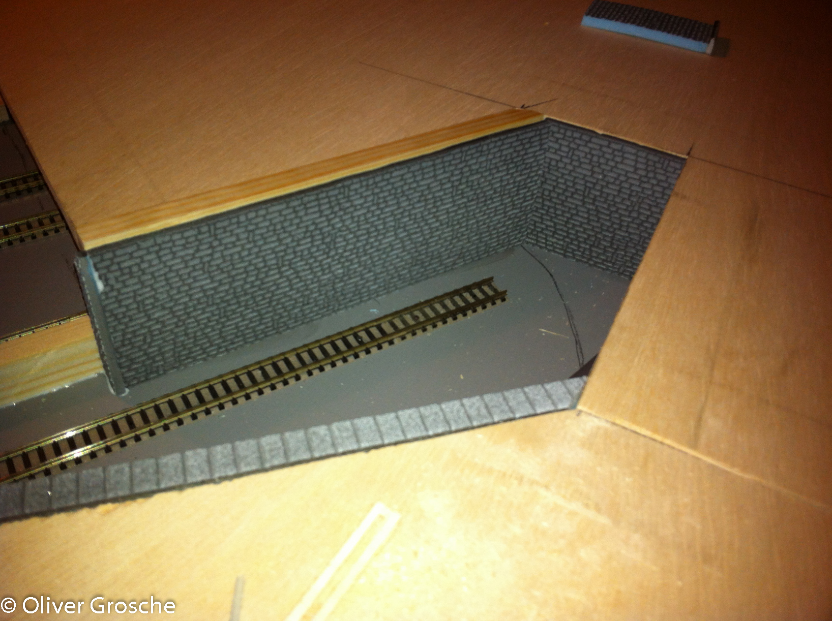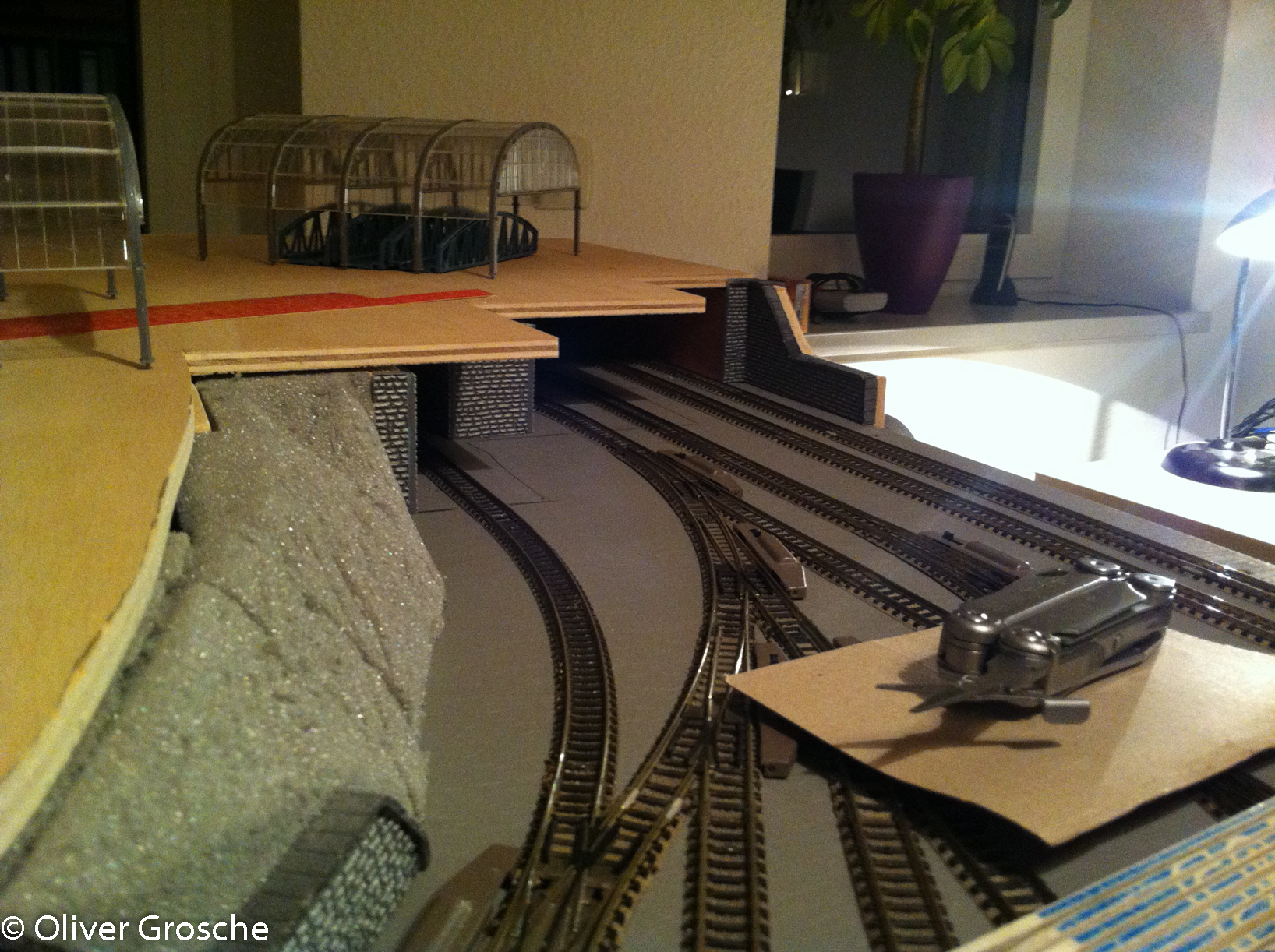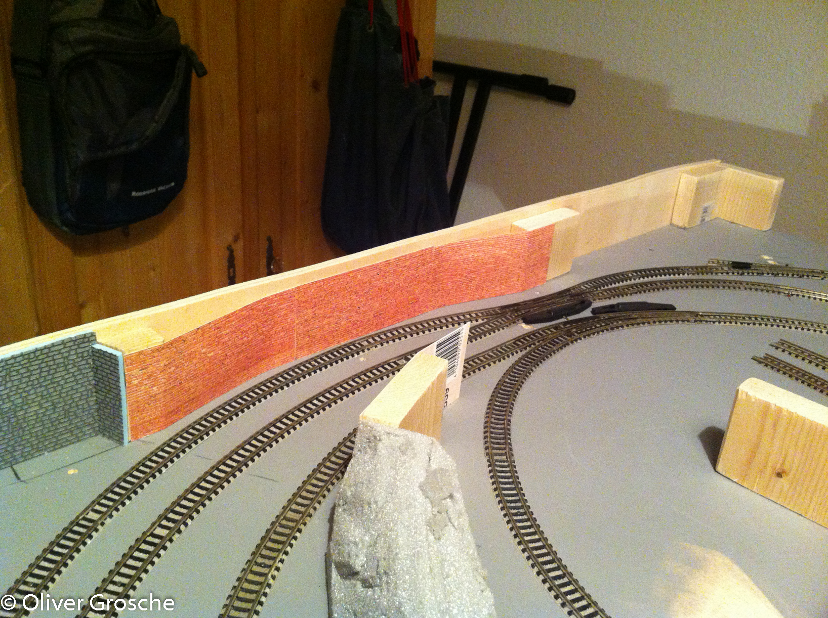 Für eine zukünftige Erweiterung der Anlage (z.B. ein FiddleYard oder so…) habe ich noch eine zusätzliche Weiche im versteckten Bahnhofsbereich eingebaut. Zudem wurden noch Restarbeiten an den Mauern gemacht.