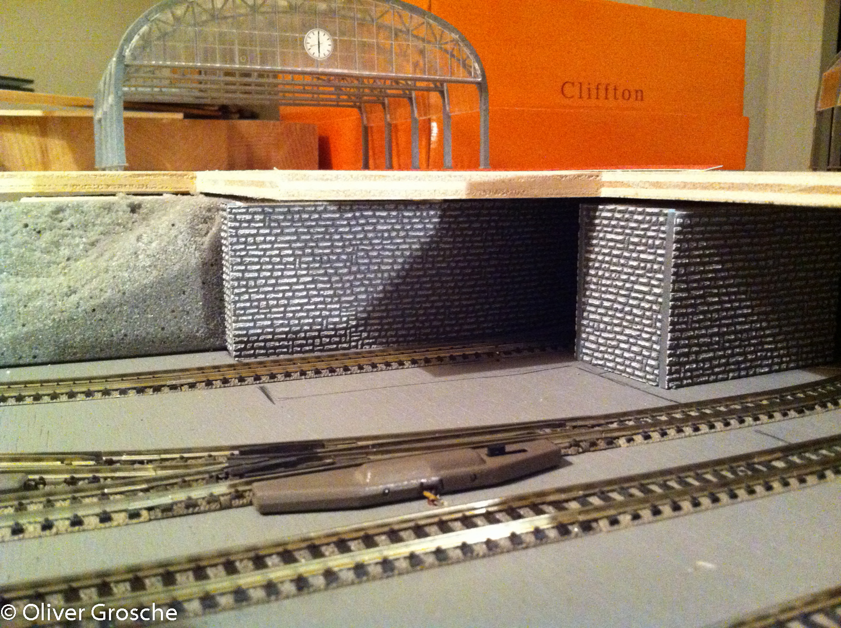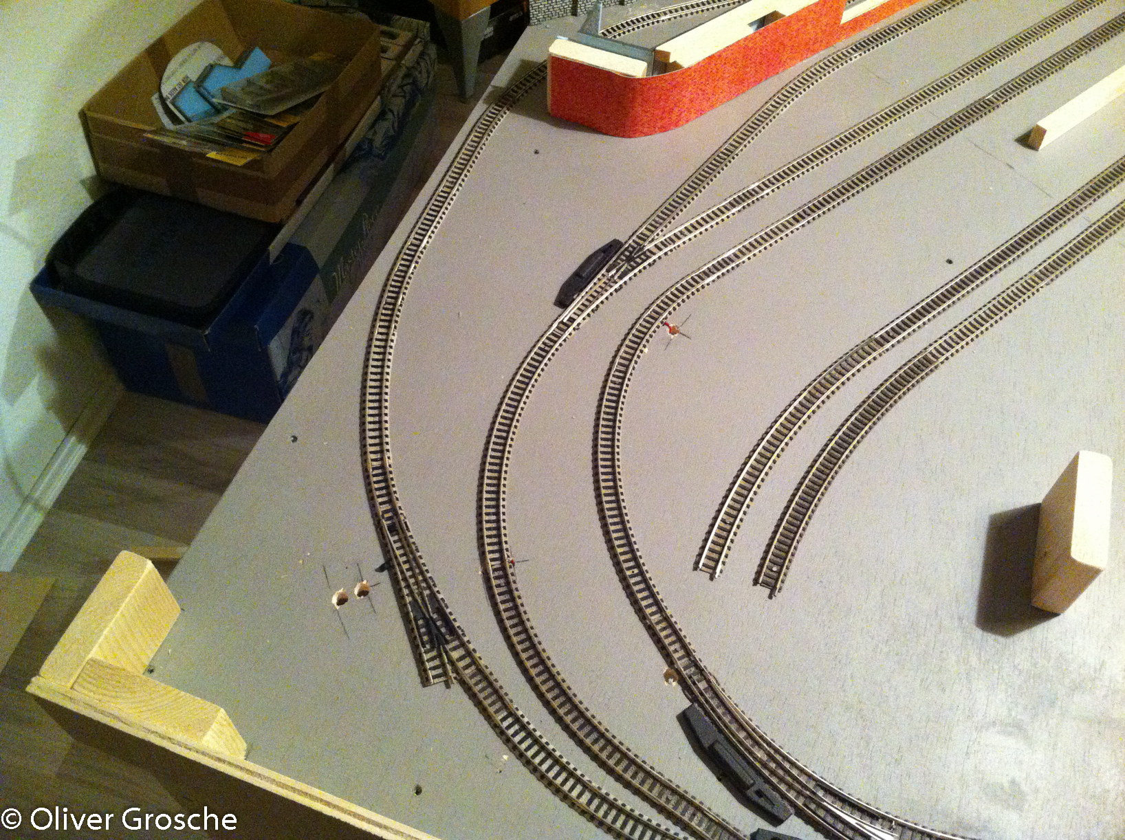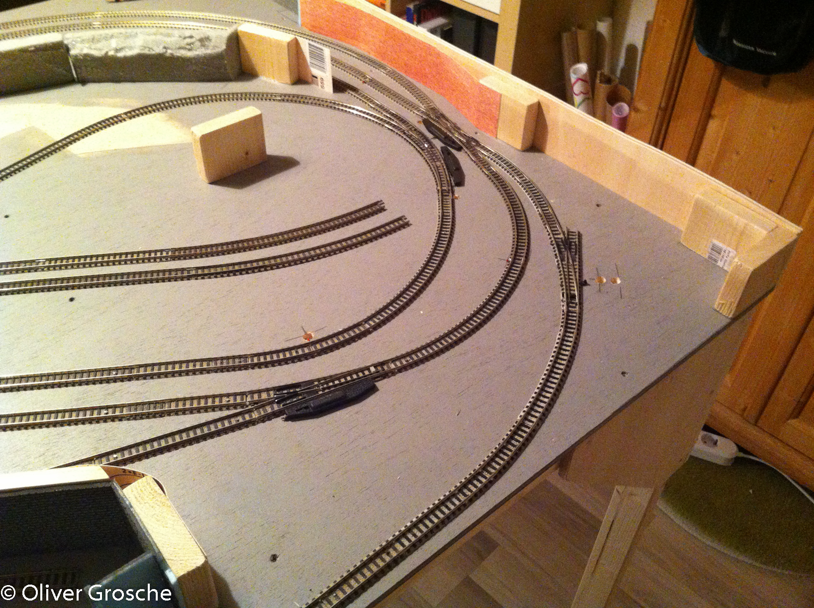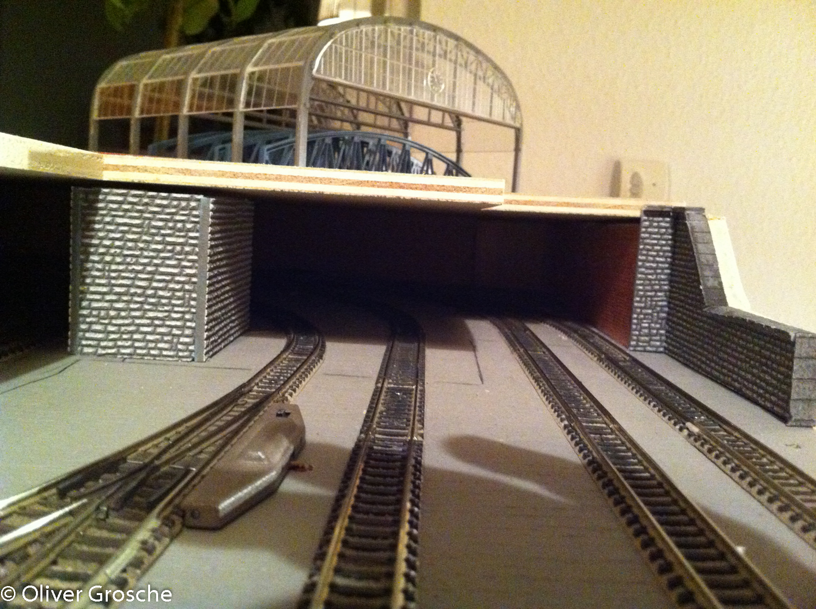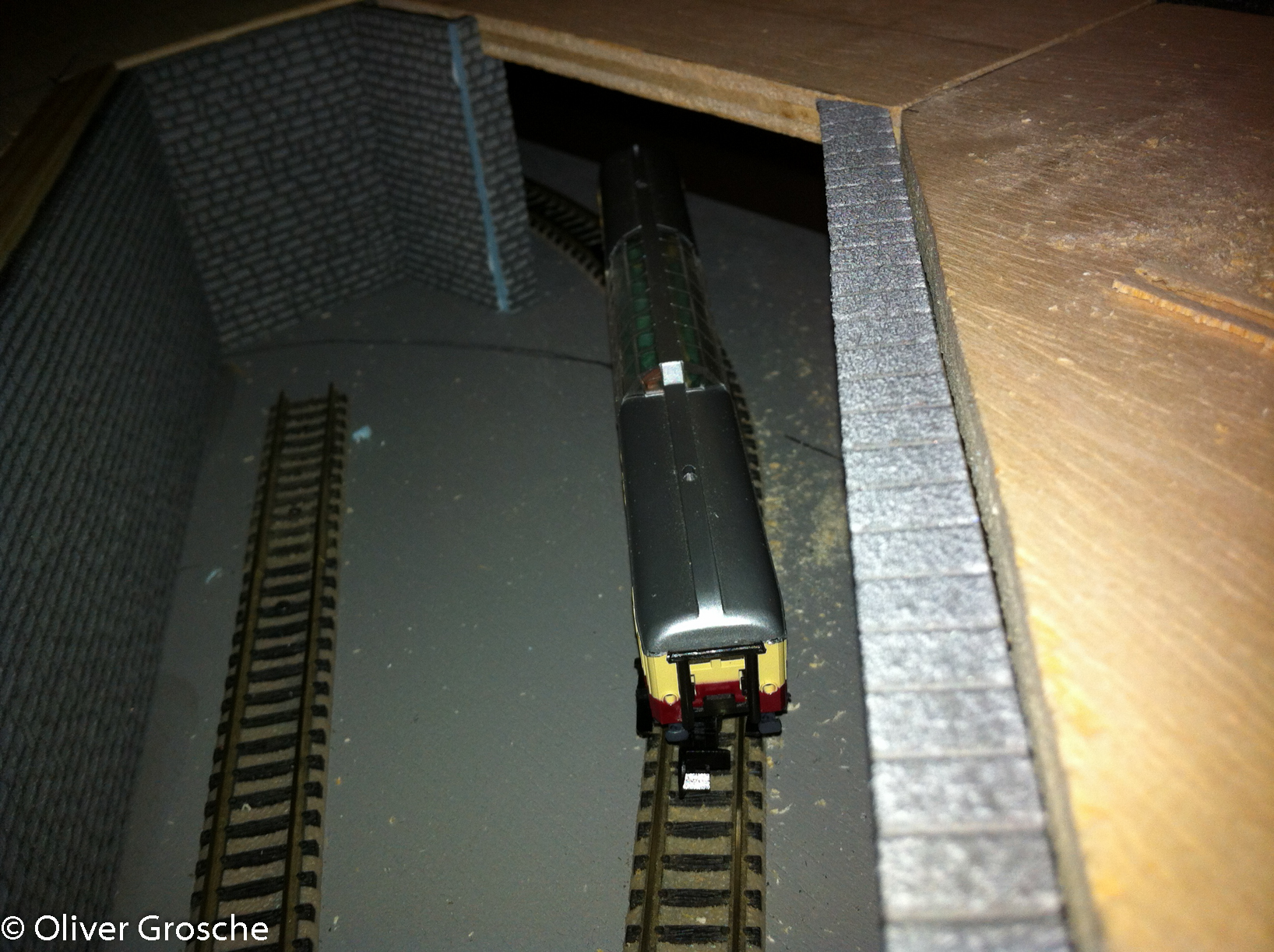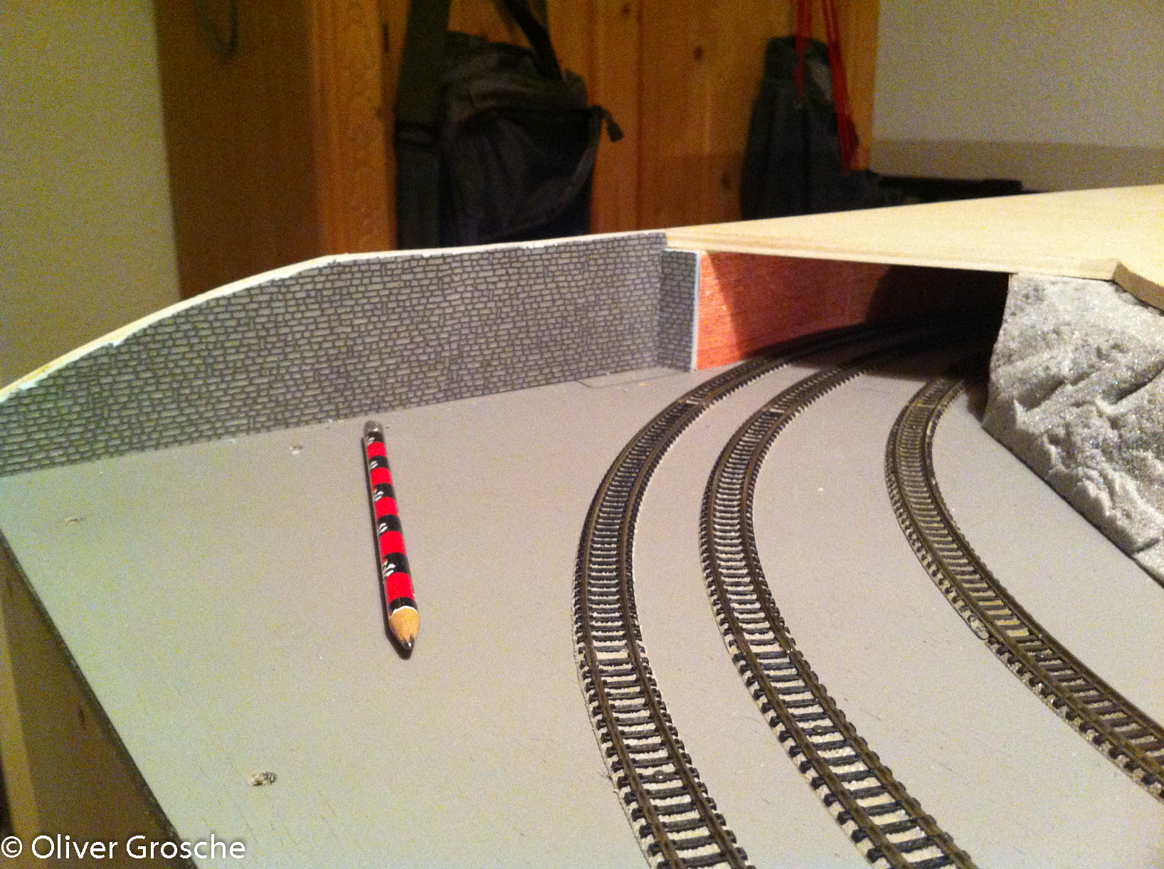 Für eine zukünftige Erweiterung der Anlage (z.B. ein FiddleYard oder so…) habe ich noch eine zusätzliche Weiche im versteckten Bahnhofsbereich eingebaut. Zudem wurden noch Restarbeiten an den Mauern gemacht.