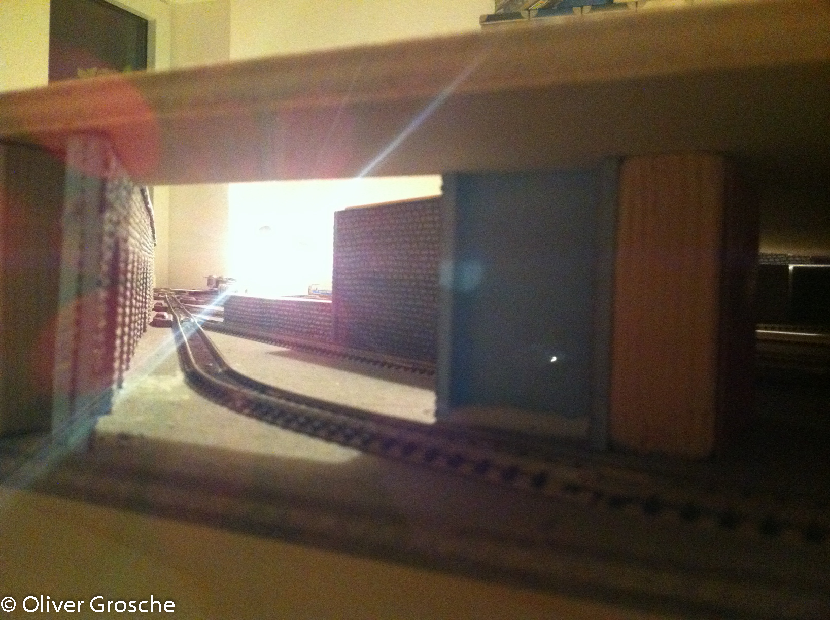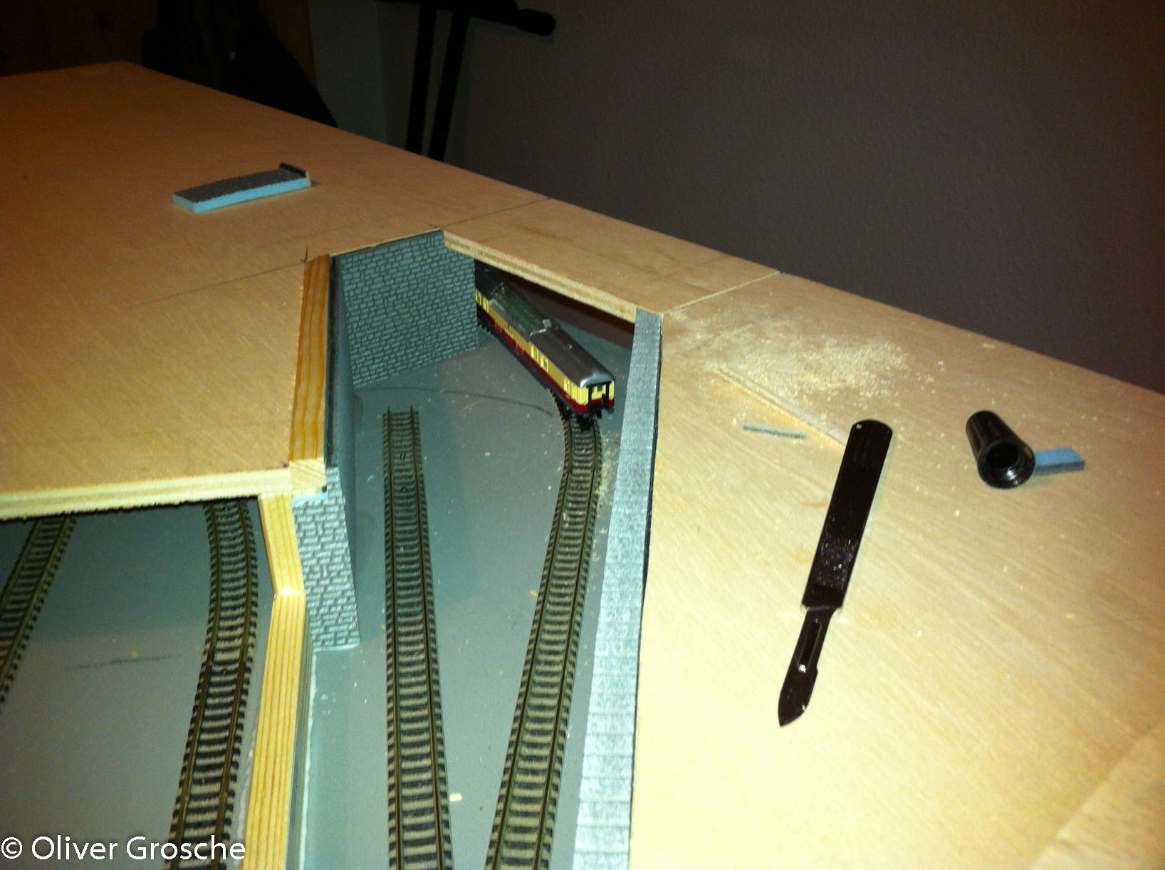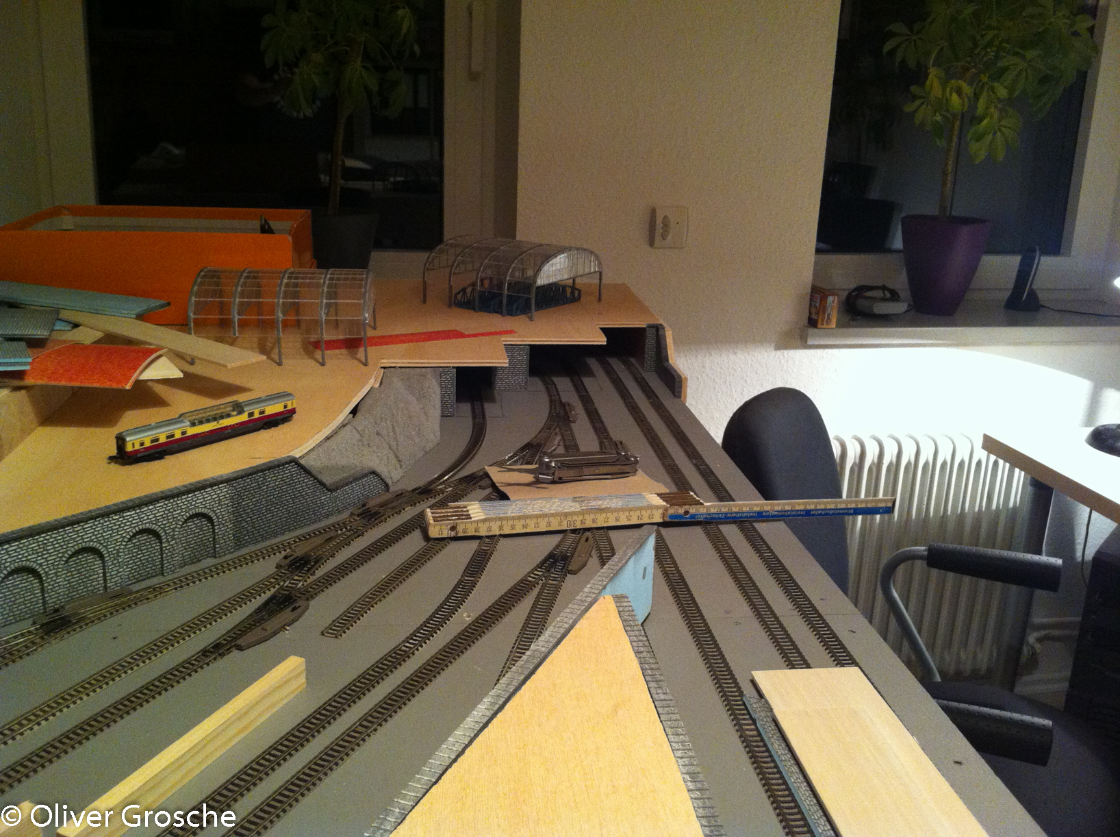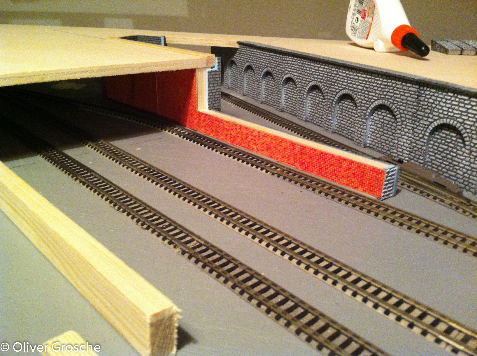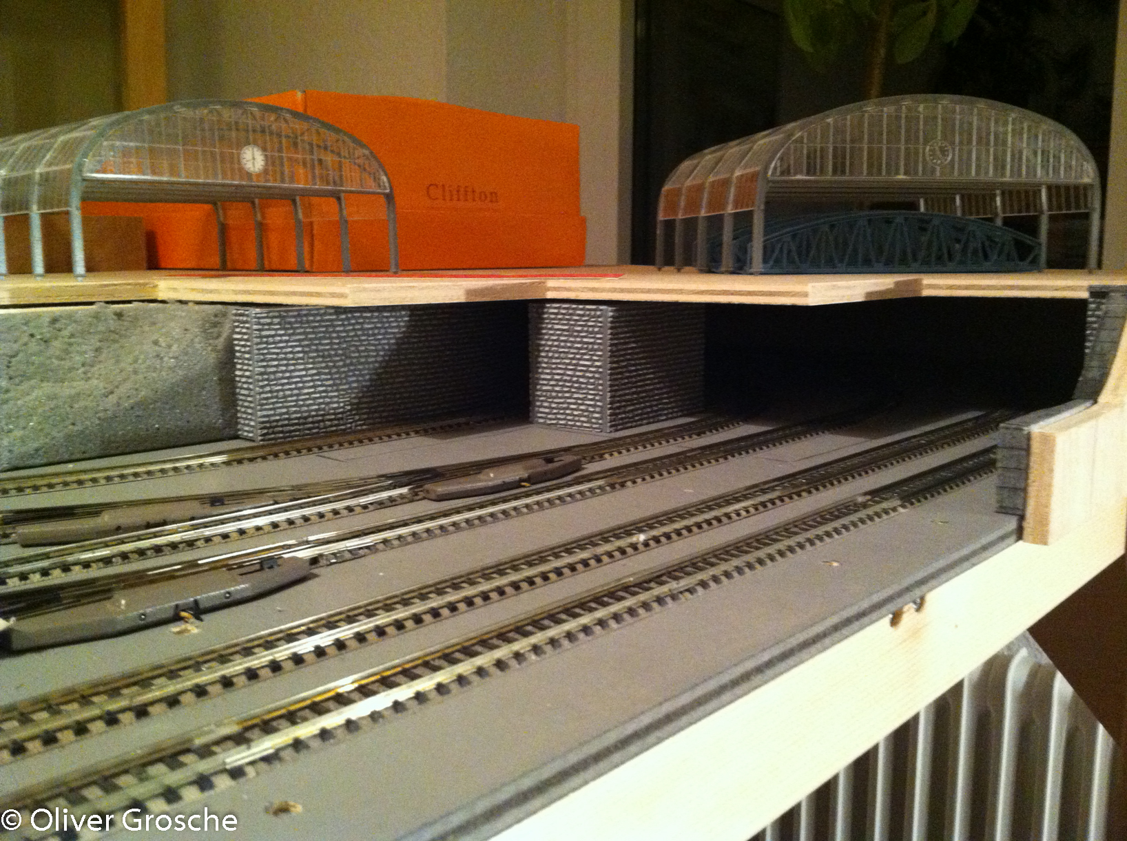 Für eine zukünftige Erweiterung der Anlage (z.B. ein FiddleYard oder so…) habe ich noch eine zusätzliche Weiche im versteckten Bahnhofsbereich eingebaut. Zudem wurden noch Restarbeiten an den Mauern gemacht.