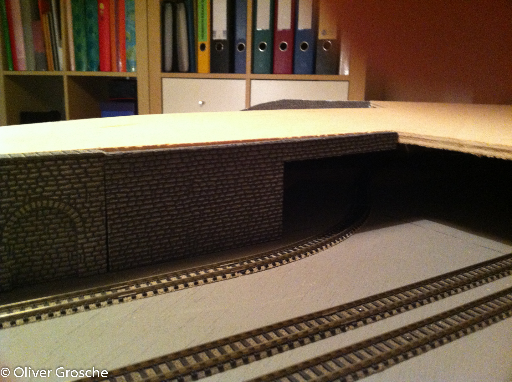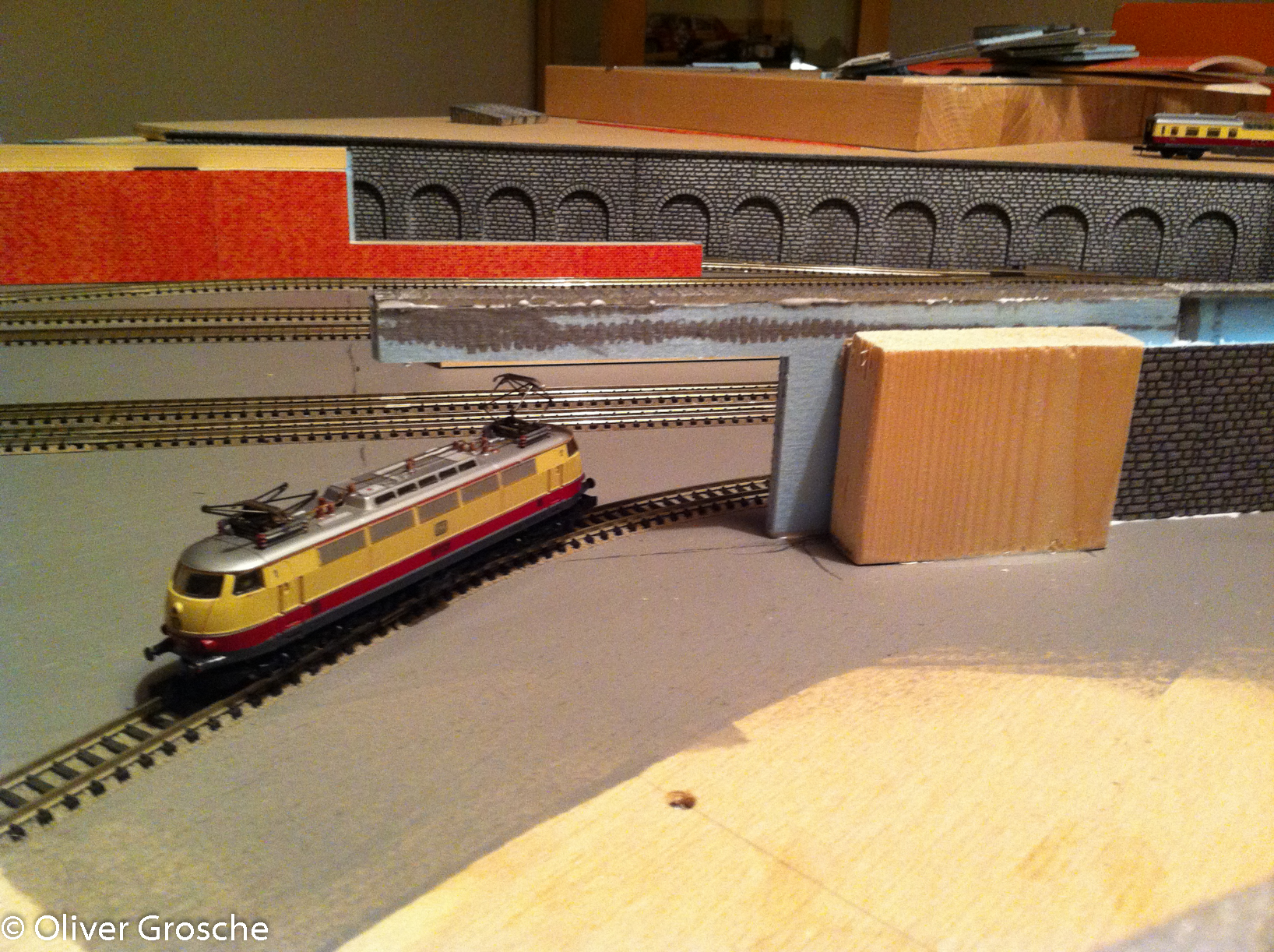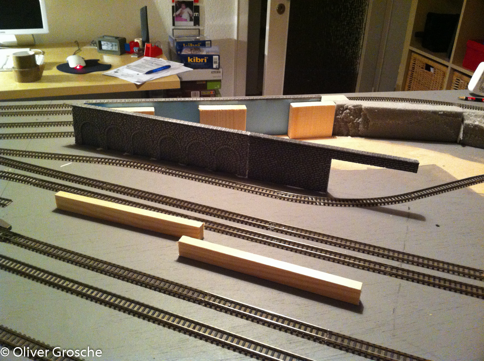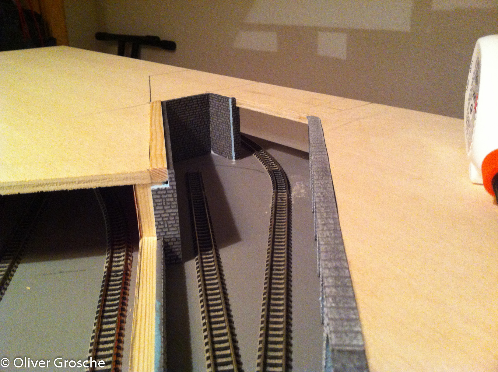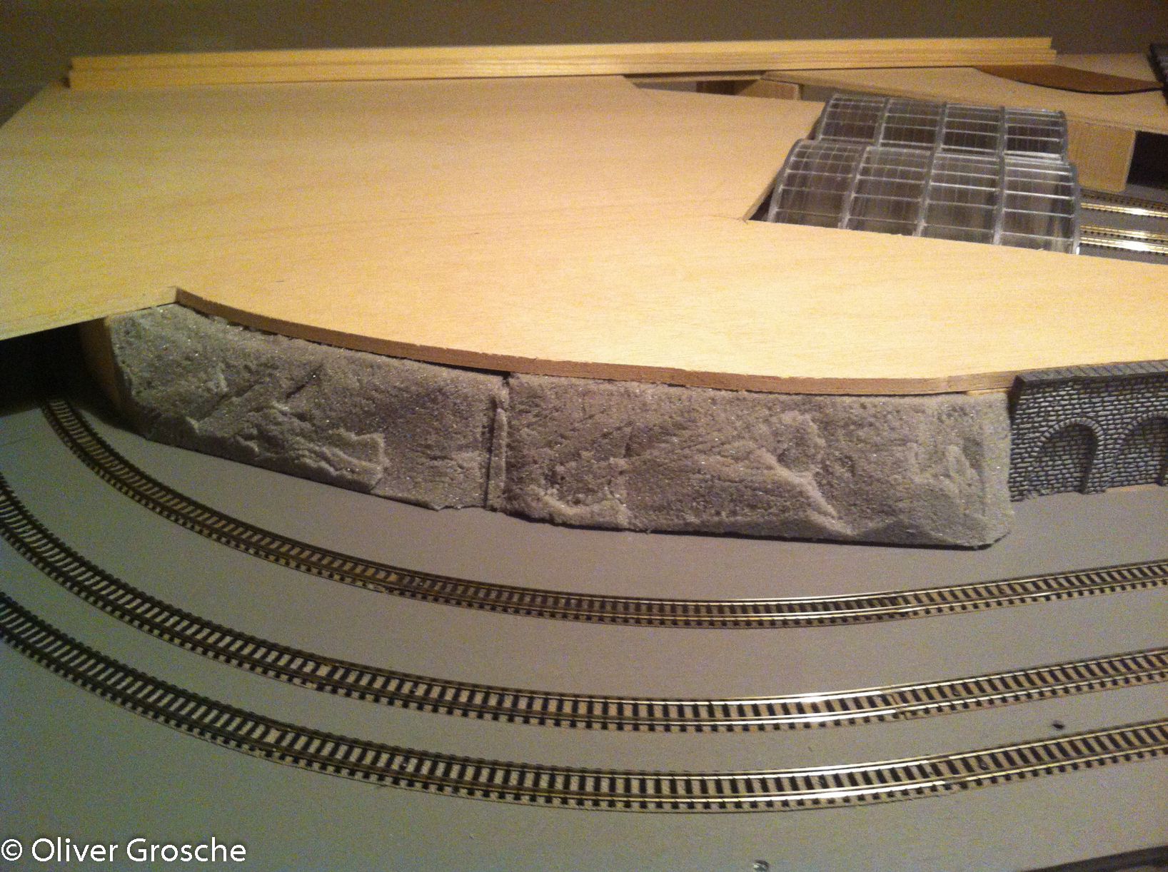 Für eine zukünftige Erweiterung der Anlage (z.B. ein FiddleYard oder so…) habe ich noch eine zusätzliche Weiche im versteckten Bahnhofsbereich eingebaut. Zudem wurden noch Restarbeiten an den Mauern gemacht.