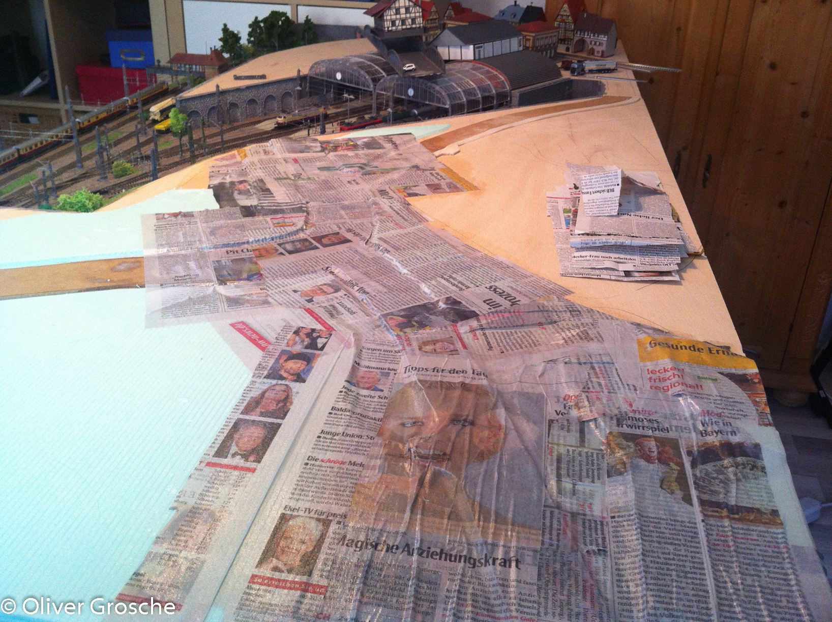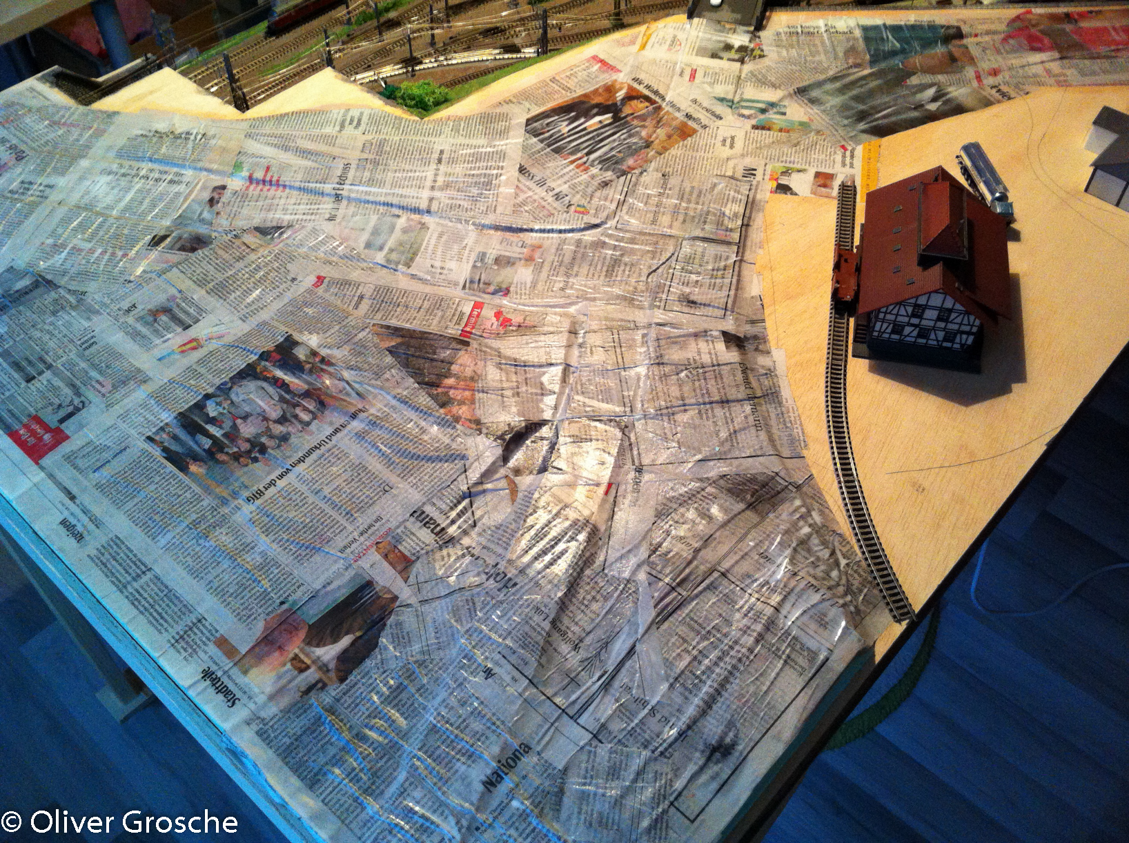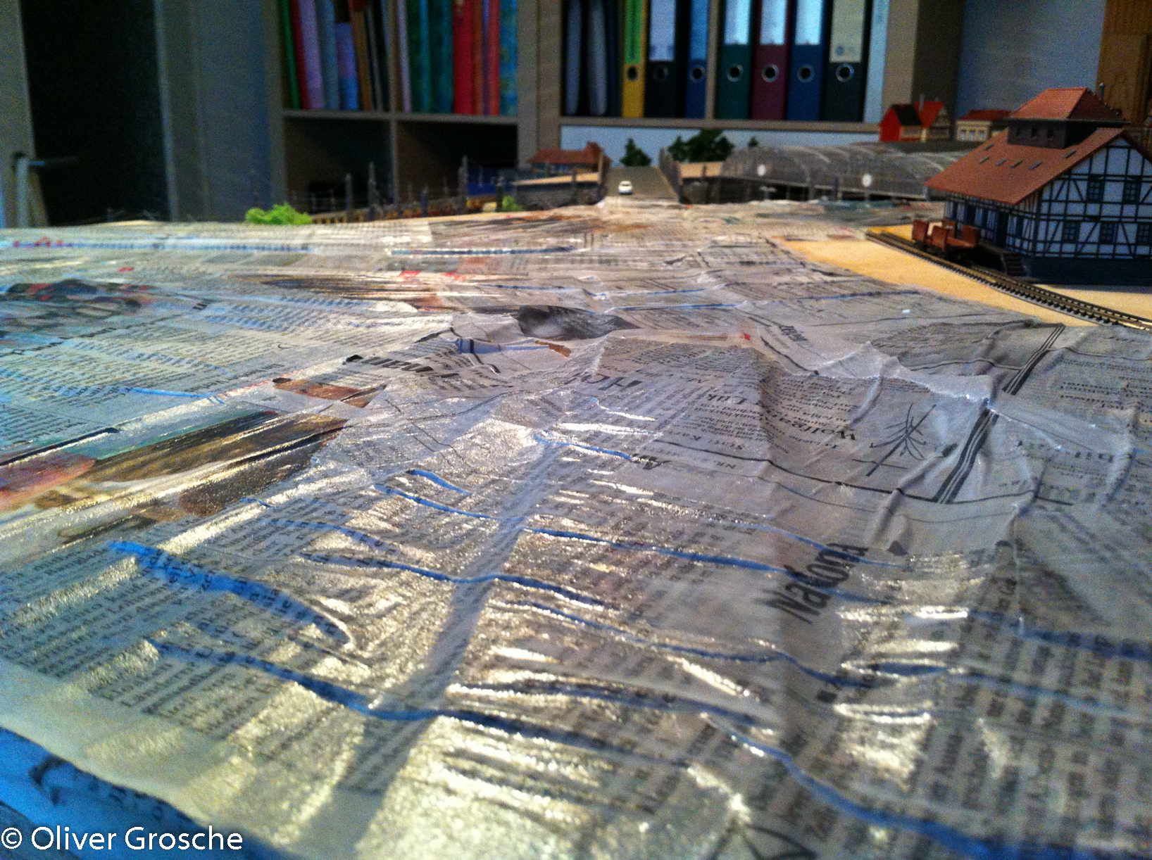 În weiteren Arbeitschritten wurde noch ein Bürgersteig erstellt und dann das ganze Gelände mit Zeitungspapier überzogen. Dazu habe ich einfach Zeitungen in Stücke gerissen und mit verdünnten Holzleim überstrichen. Leider hatte ich da noch nicht die faltenbildung bedacht…