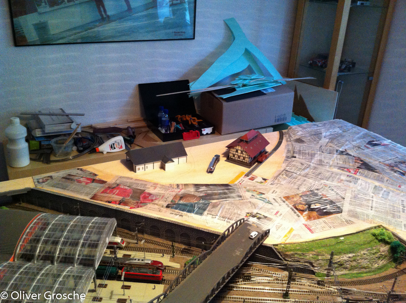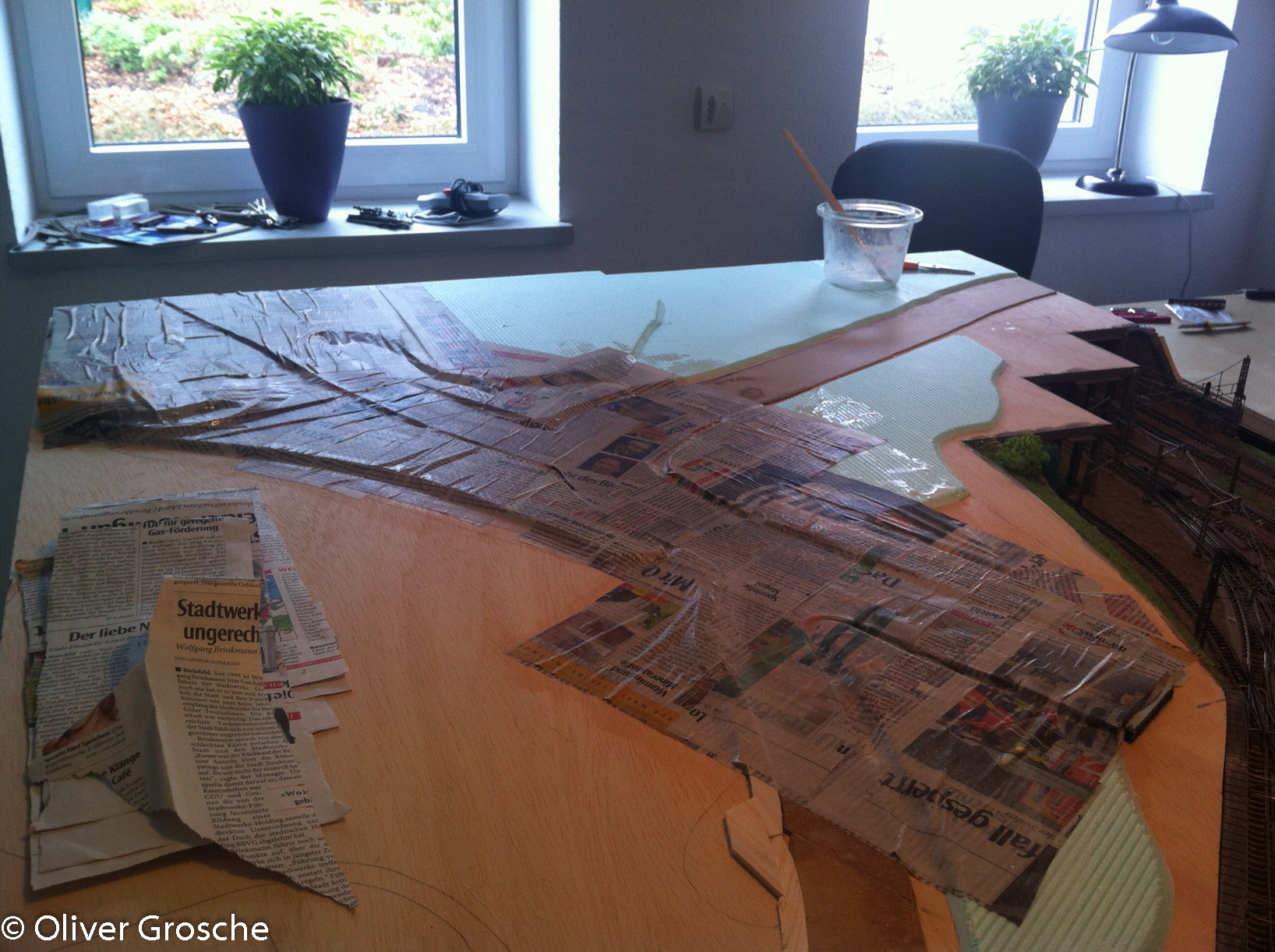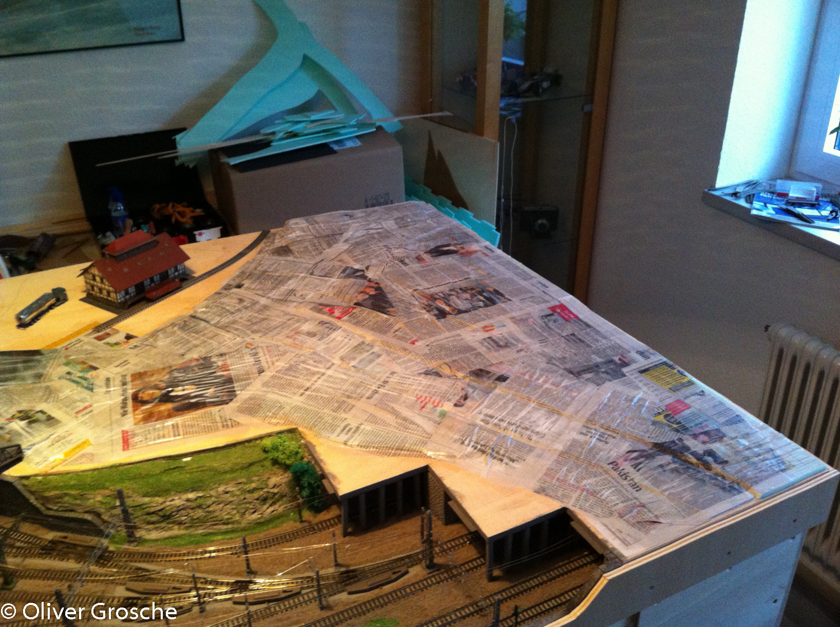 În weiteren Arbeitschritten wurde noch ein Bürgersteig erstellt und dann das ganze Gelände mit Zeitungspapier überzogen. Dazu habe ich einfach Zeitungen in Stücke gerissen und mit verdünnten Holzleim überstrichen. Leider hatte ich da noch nicht die faltenbildung bedacht…