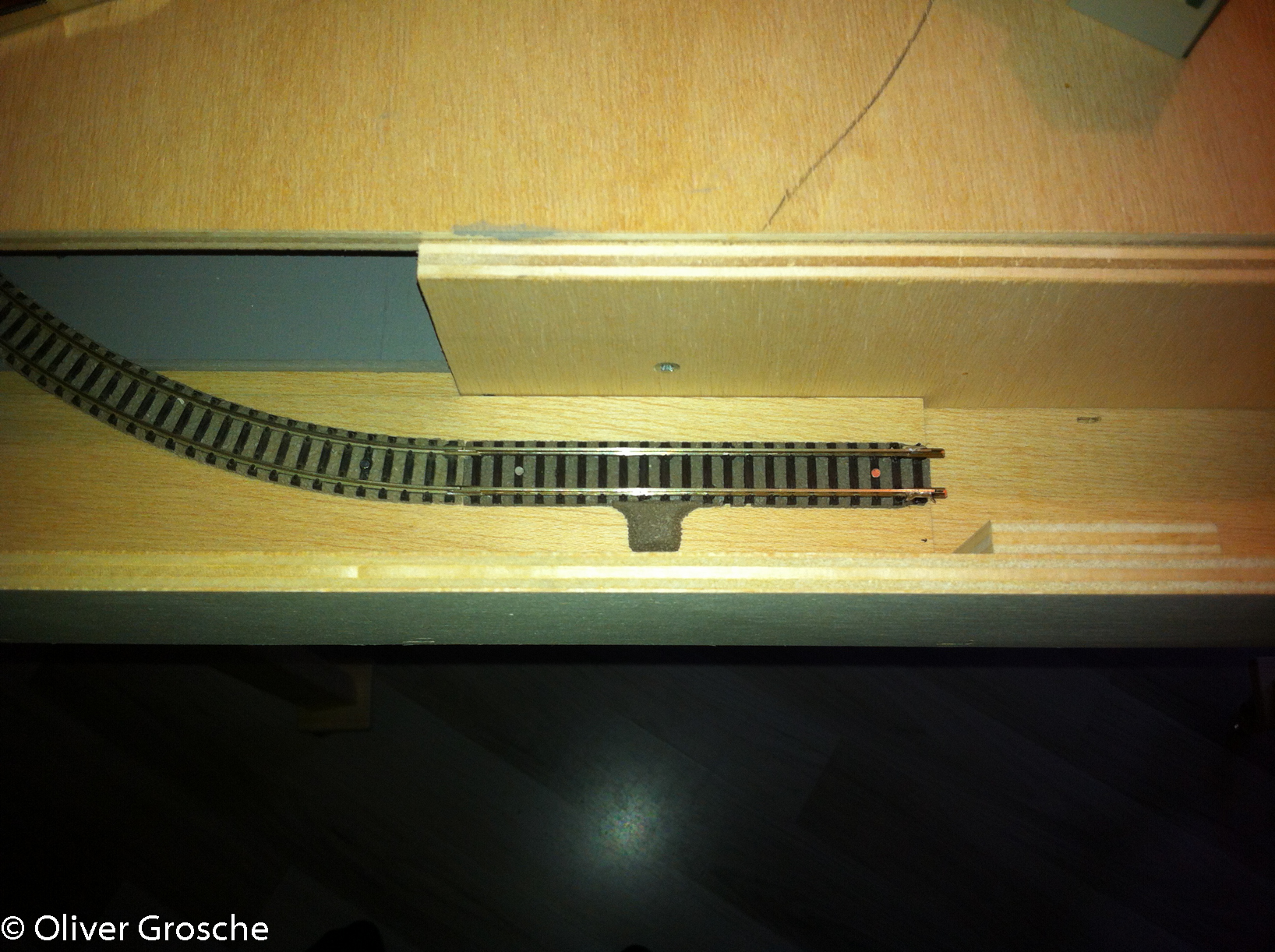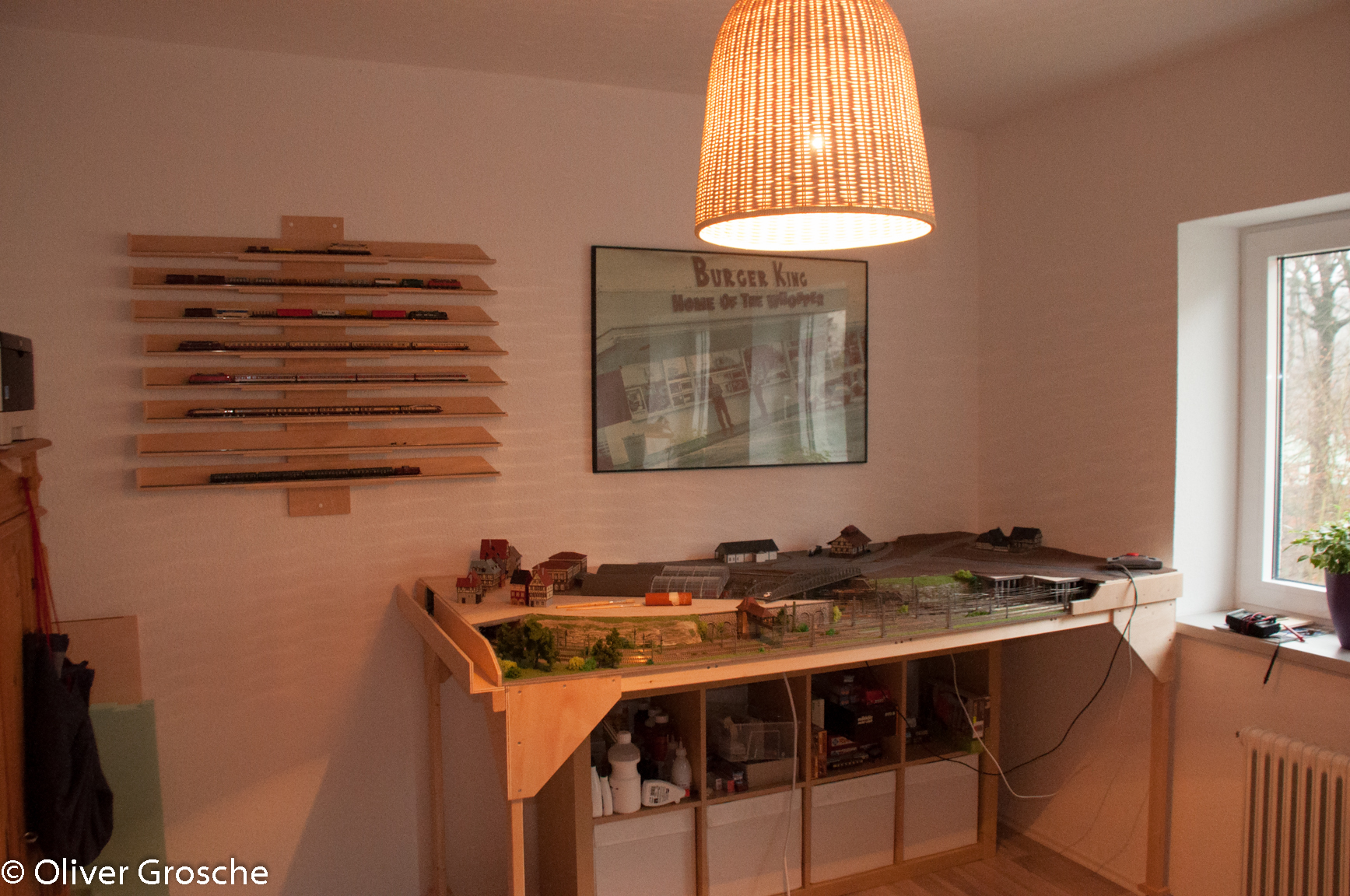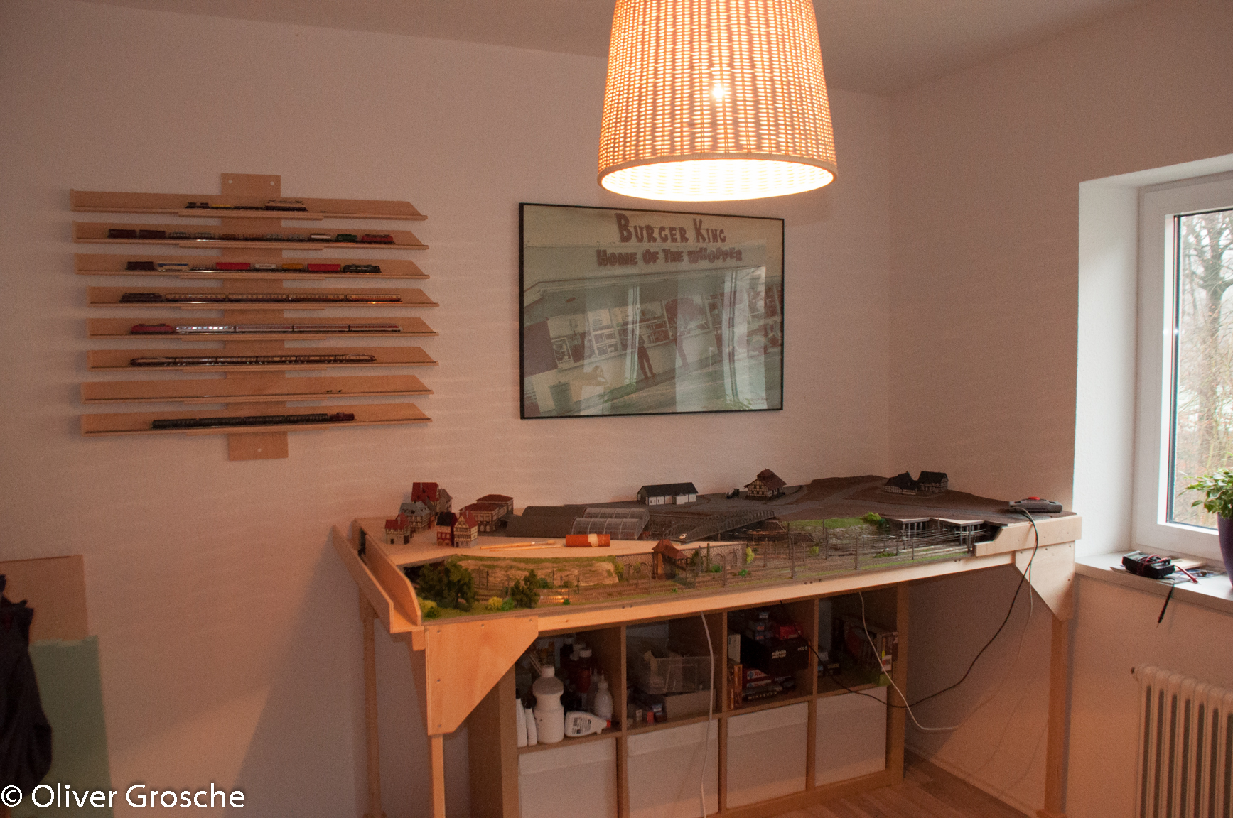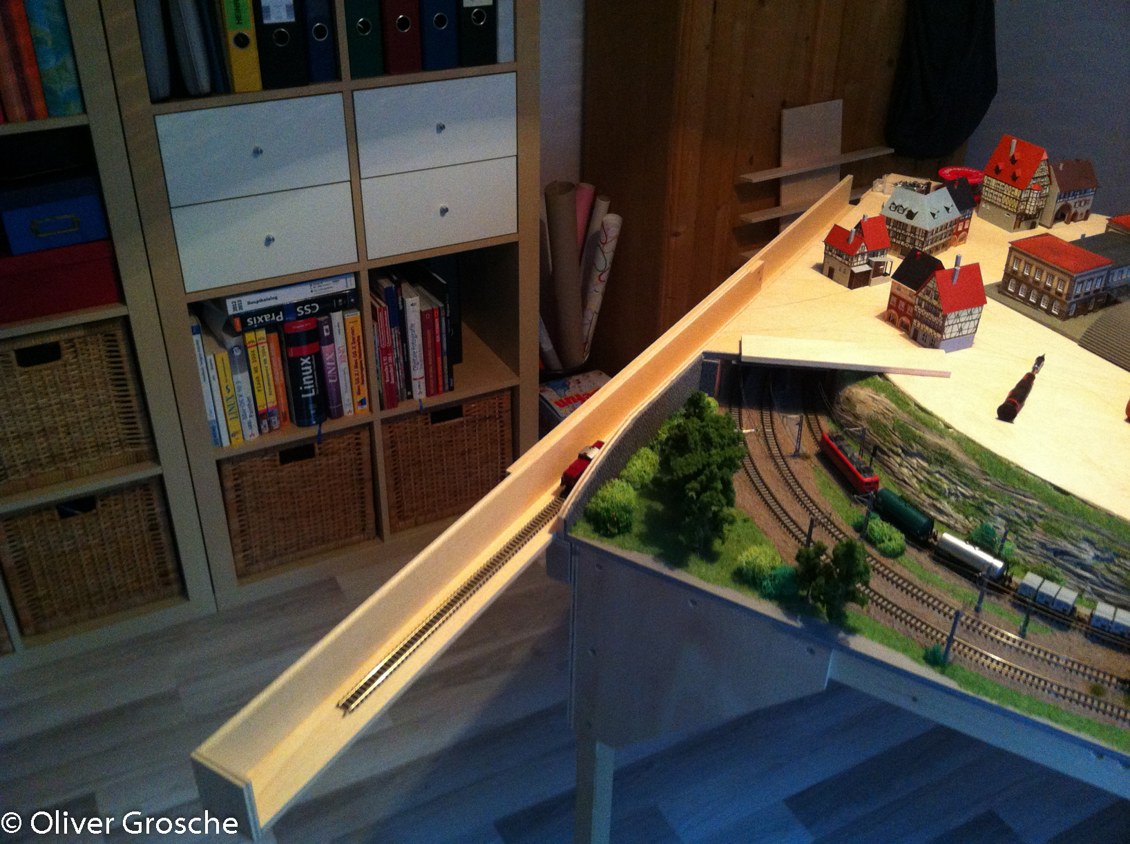 Auf einem meiner älteren Bilder konnte man ja im linken Anlagenbereich (im Tunnel) einen Abzweig erkennen, um die Anlage erweitern zu können. Dieser wurde nun mit einer Erweiterung in Betrieb genommen. Damit lassen sich nun die Züge von der Bahn im ganzen runterfahren und in einem eigens dazu gebauten Regal ablegen/verstauen.