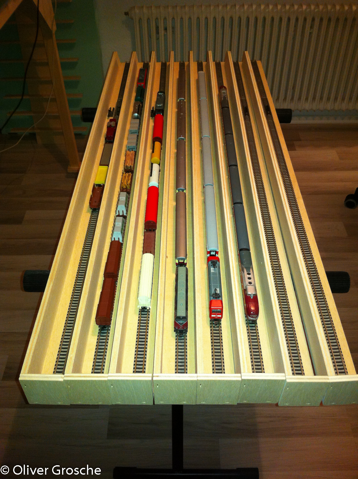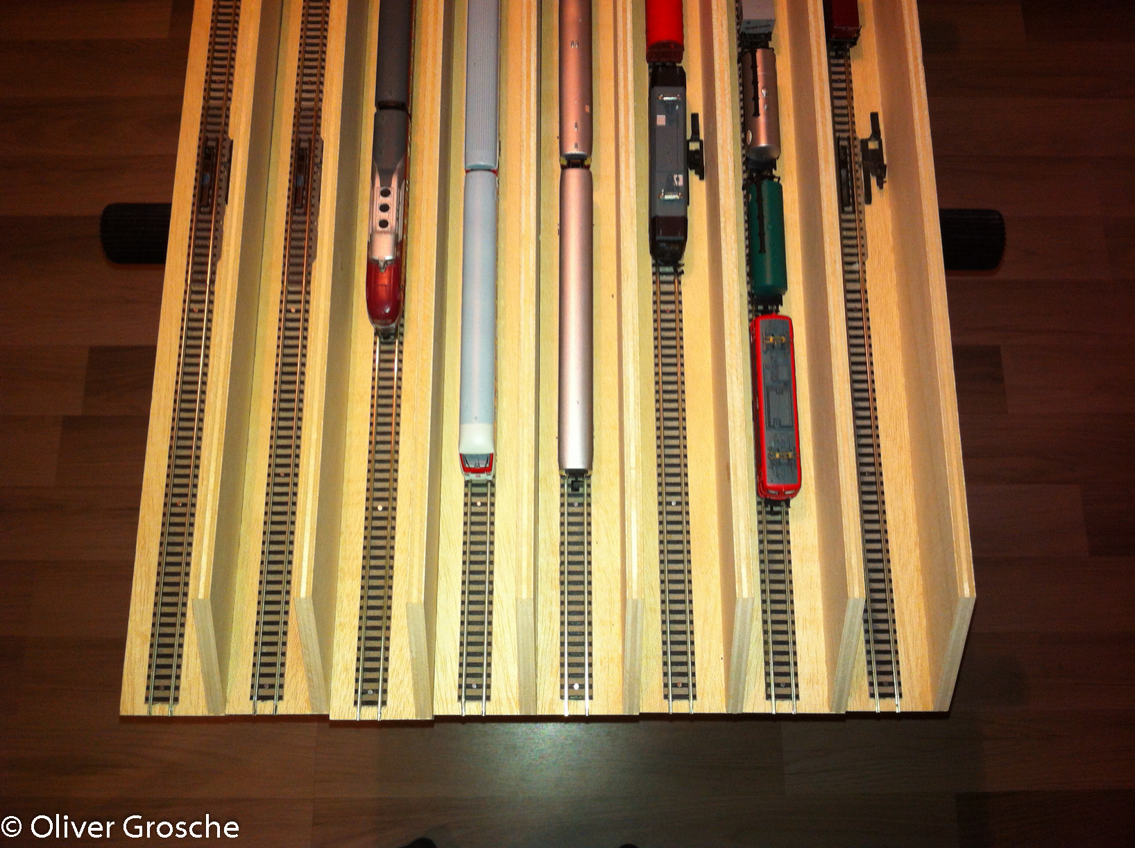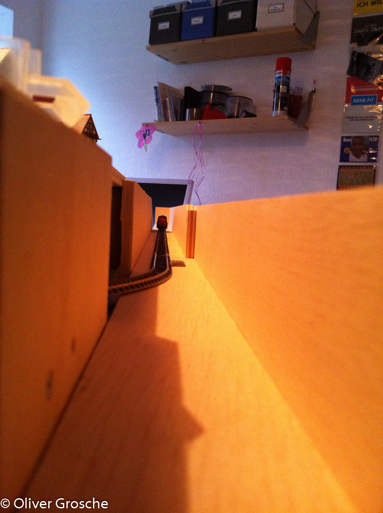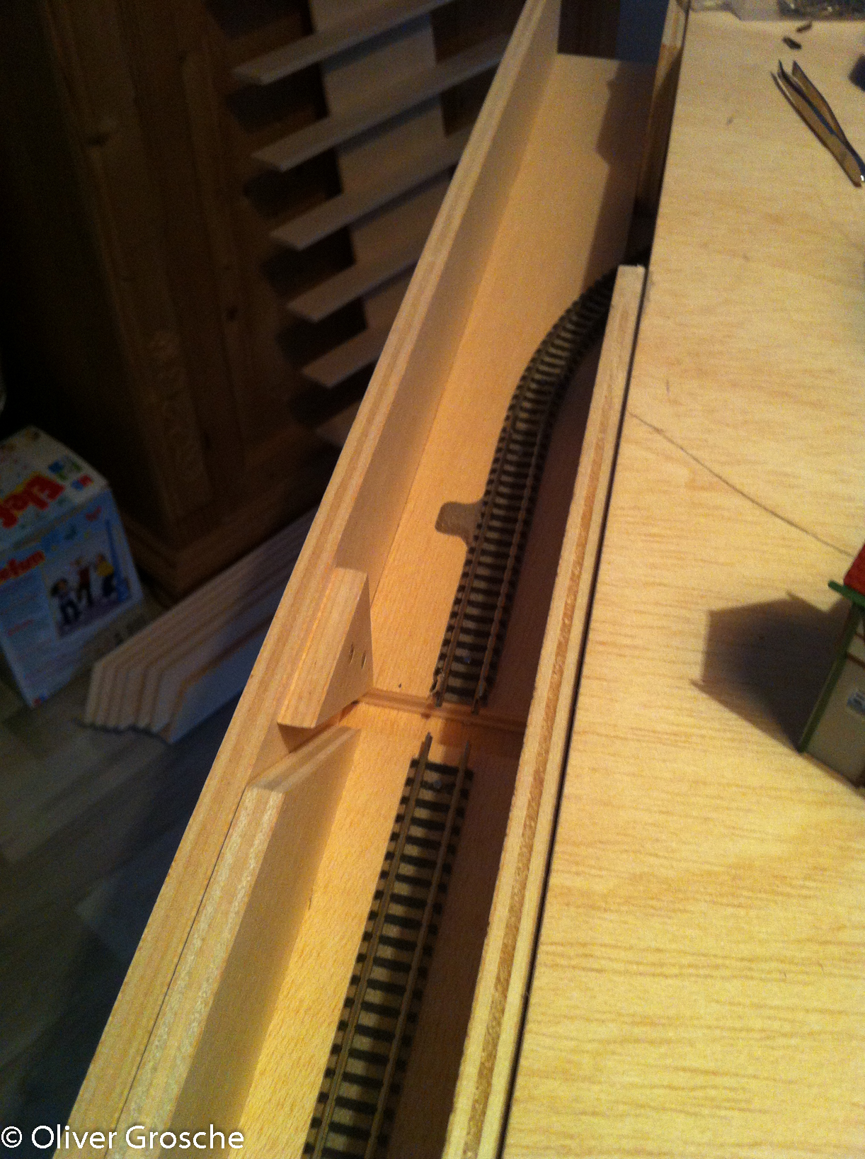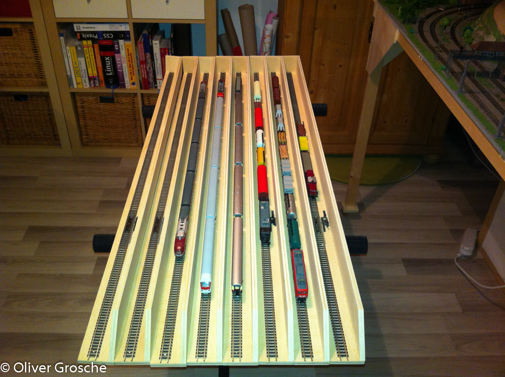Auf einem meiner älteren Bilder konnte man ja im linken Anlagenbereich (im Tunnel) einen Abzweig erkennen, um die Anlage erweitern zu können. Dieser wurde nun mit einer Erweiterung in Betrieb genommen. Damit lassen sich nun die Züge von der Bahn im ganzen runterfahren und in einem eigens dazu gebauten Regal ablegen/verstauen.
