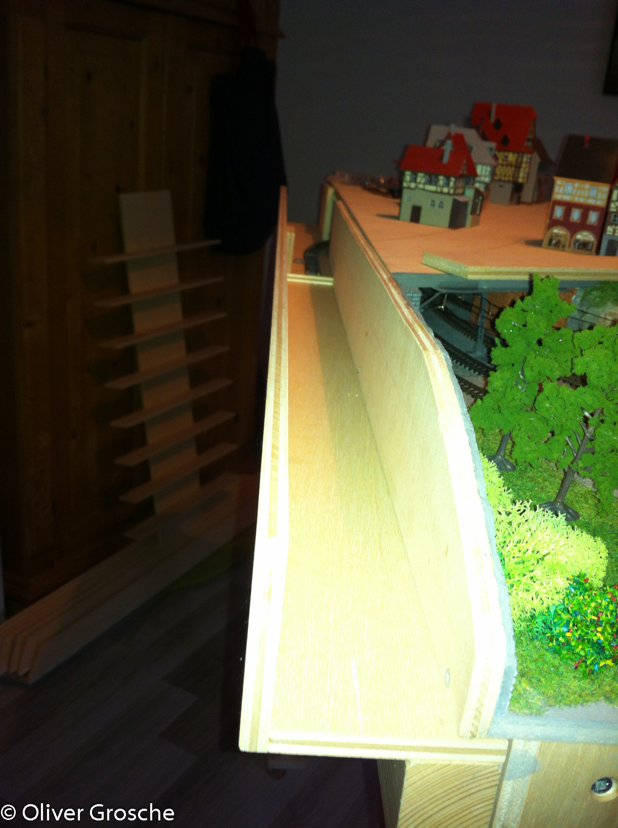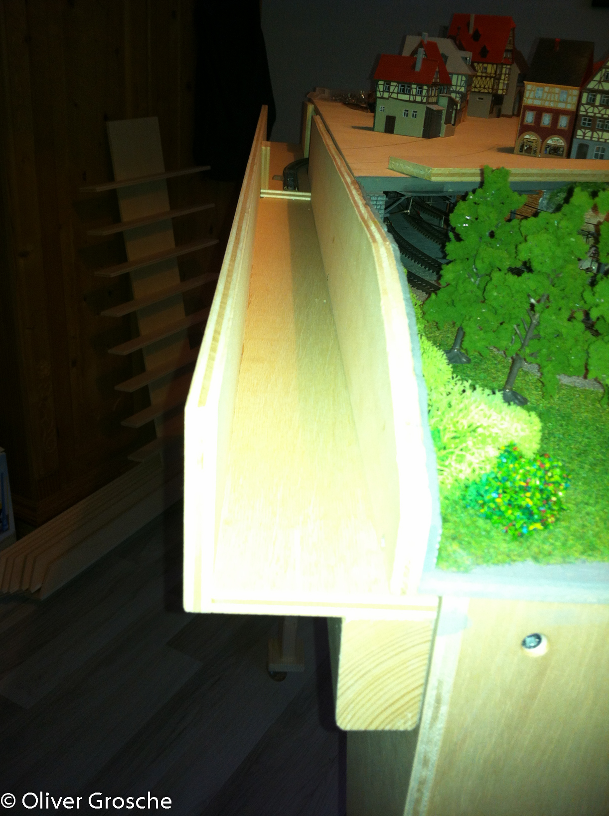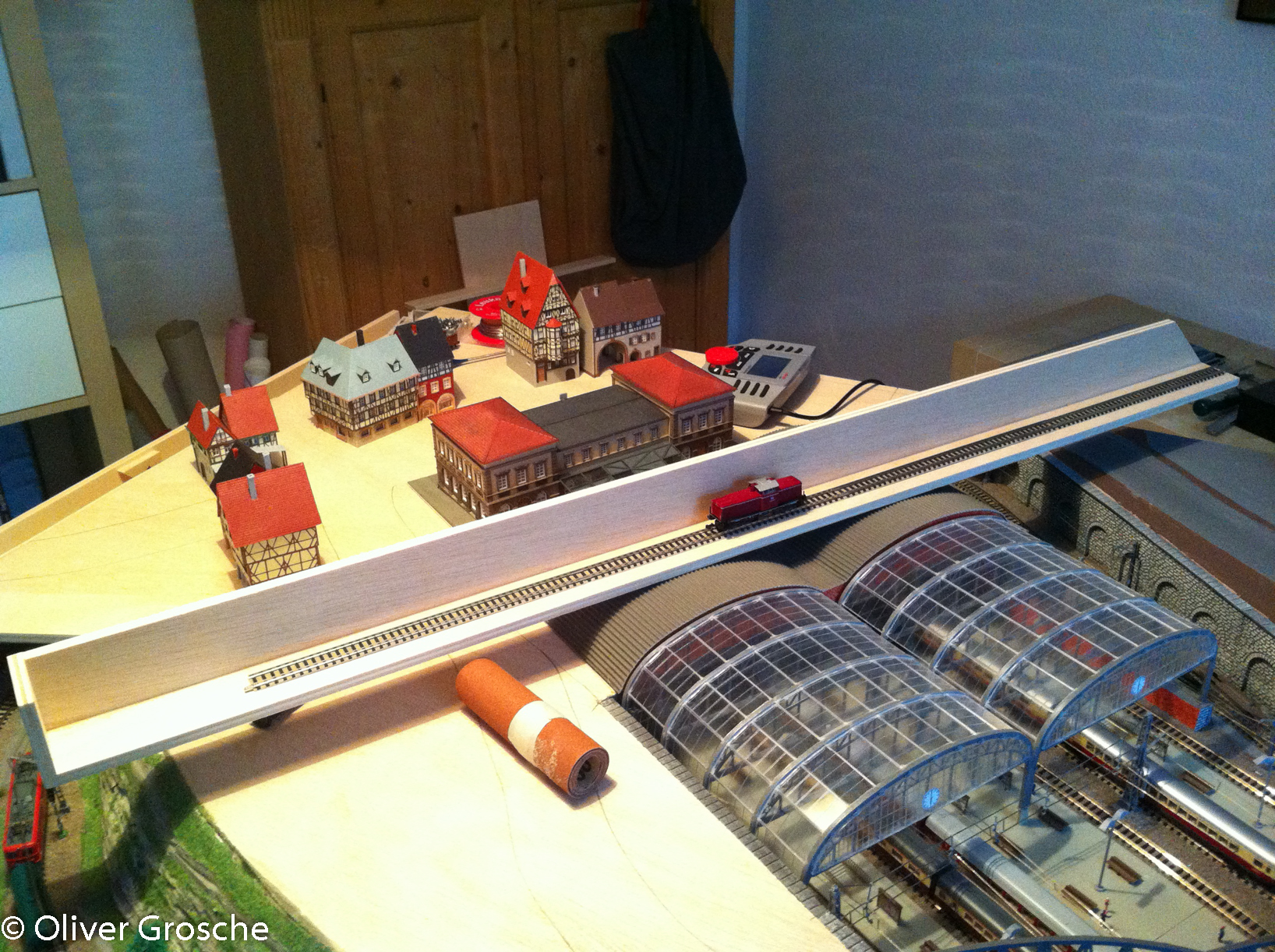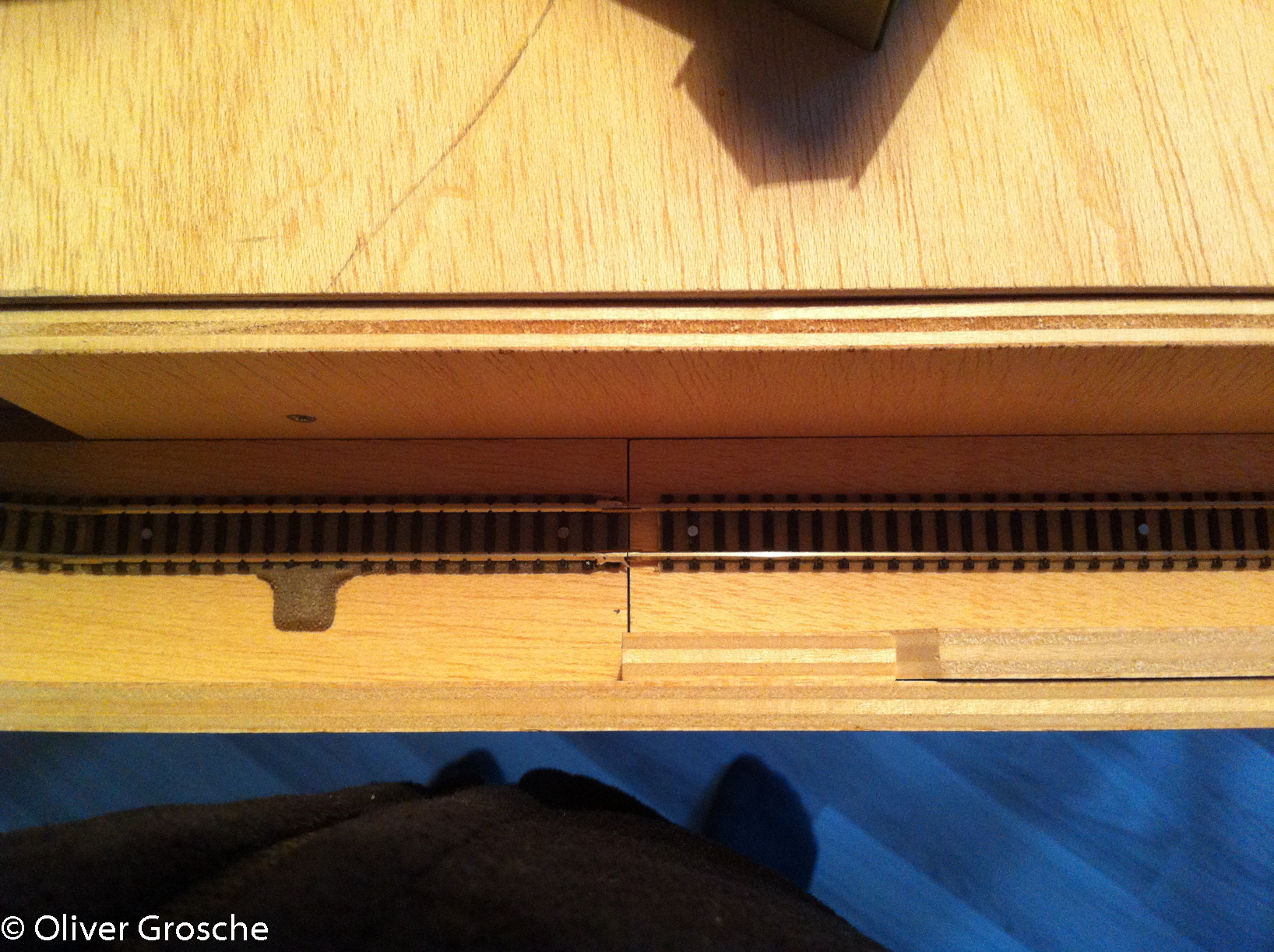 Auf einem meiner älteren Bilder konnte man ja im linken Anlagenbereich (im Tunnel) einen Abzweig erkennen, um die Anlage erweitern zu können. Dieser wurde nun mit einer Erweiterung in Betrieb genommen. Damit lassen sich nun die Züge von der Bahn im ganzen runterfahren und in einem eigens dazu gebauten Regal ablegen/verstauen.