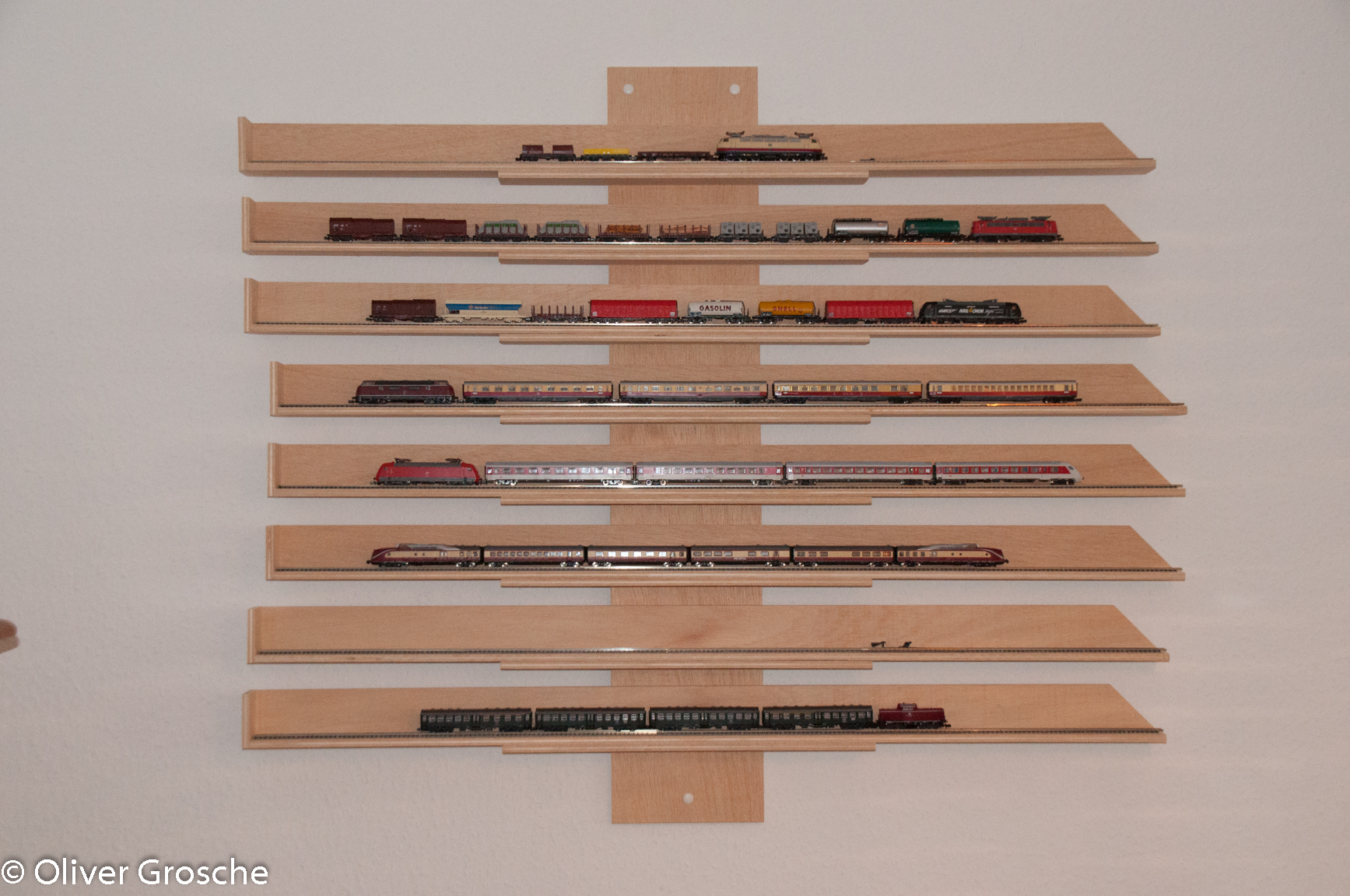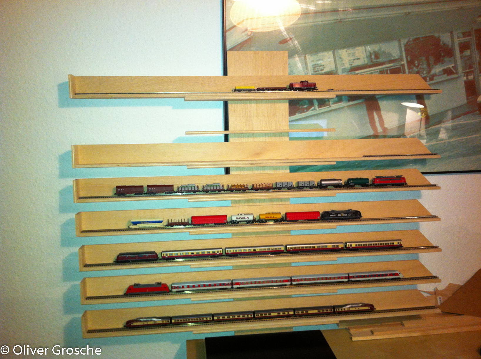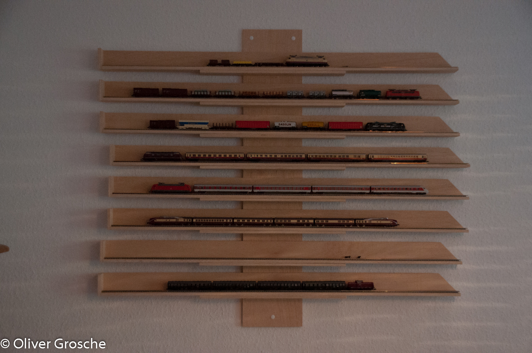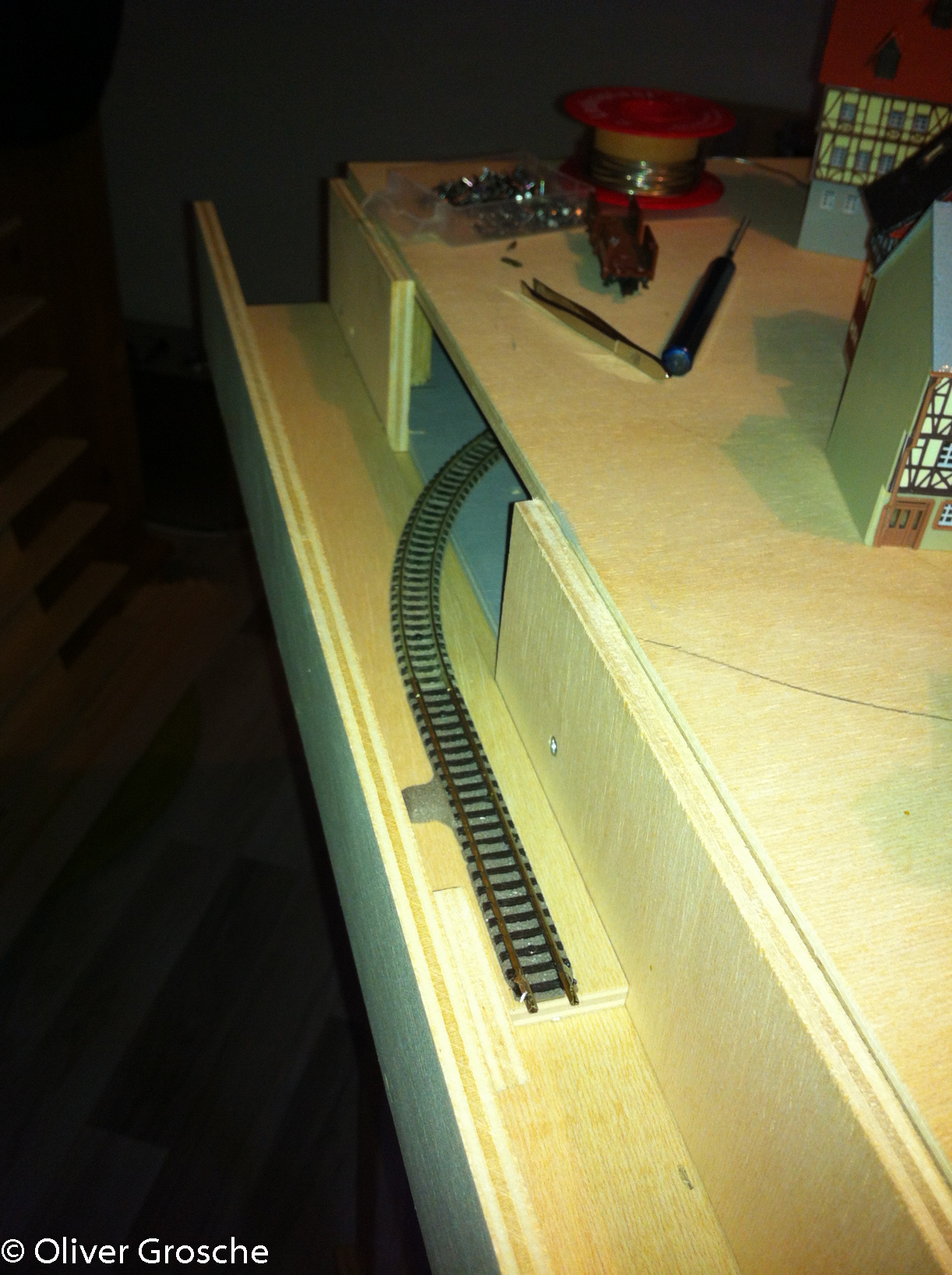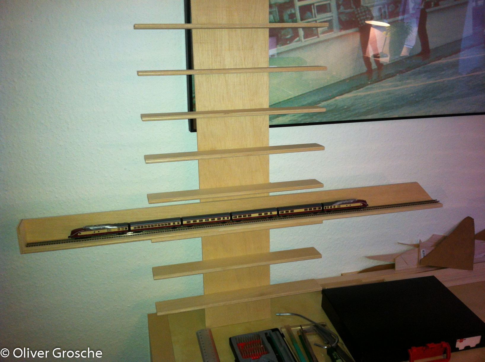 Auf einem meiner älteren Bilder konnte man ja im linken Anlagenbereich (im Tunnel) einen Abzweig erkennen, um die Anlage erweitern zu können. Dieser wurde nun mit einer Erweiterung in Betrieb genommen. Damit lassen sich nun die Züge von der Bahn im ganzen runterfahren und in einem eigens dazu gebauten Regal ablegen/verstauen.