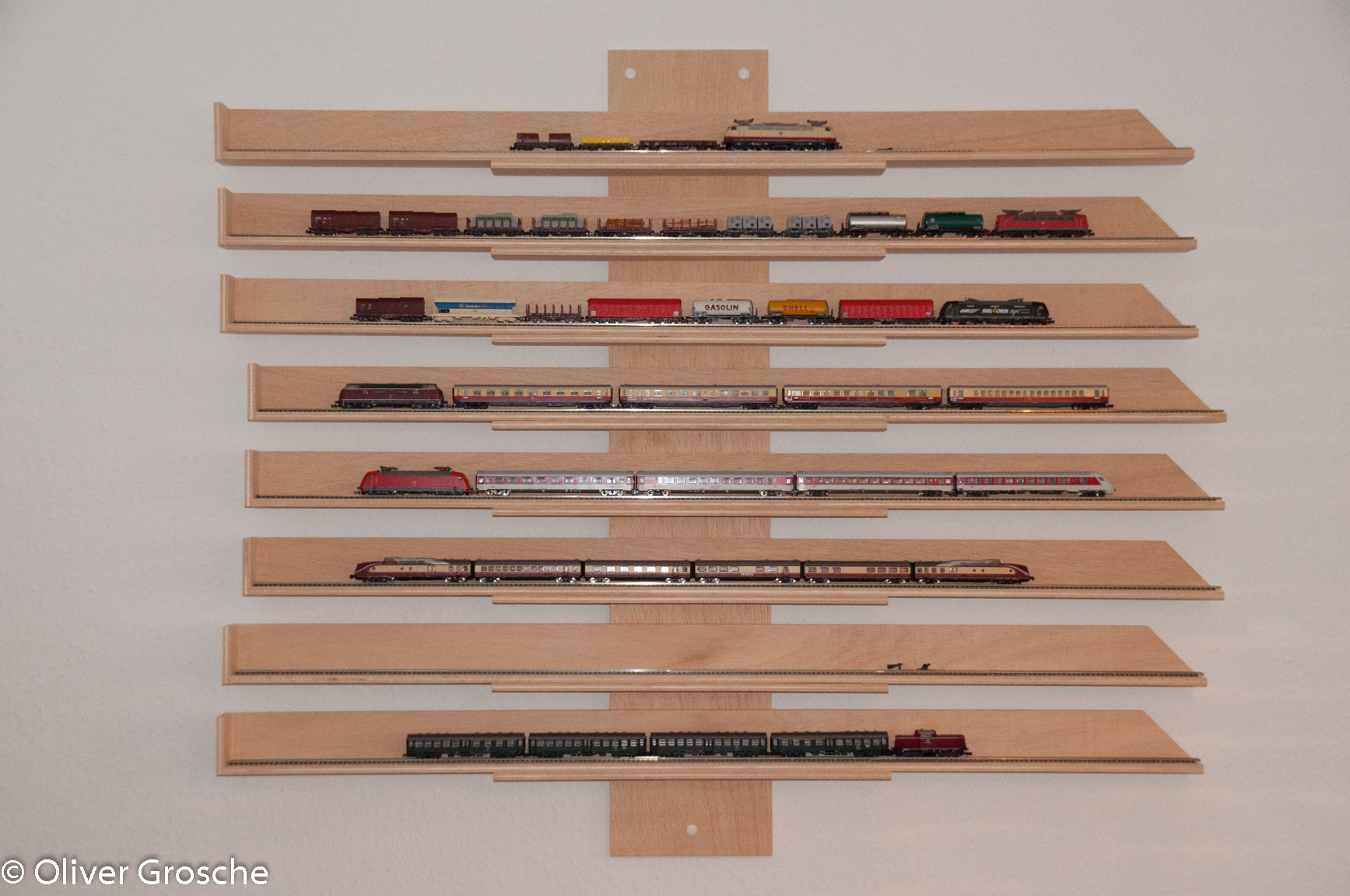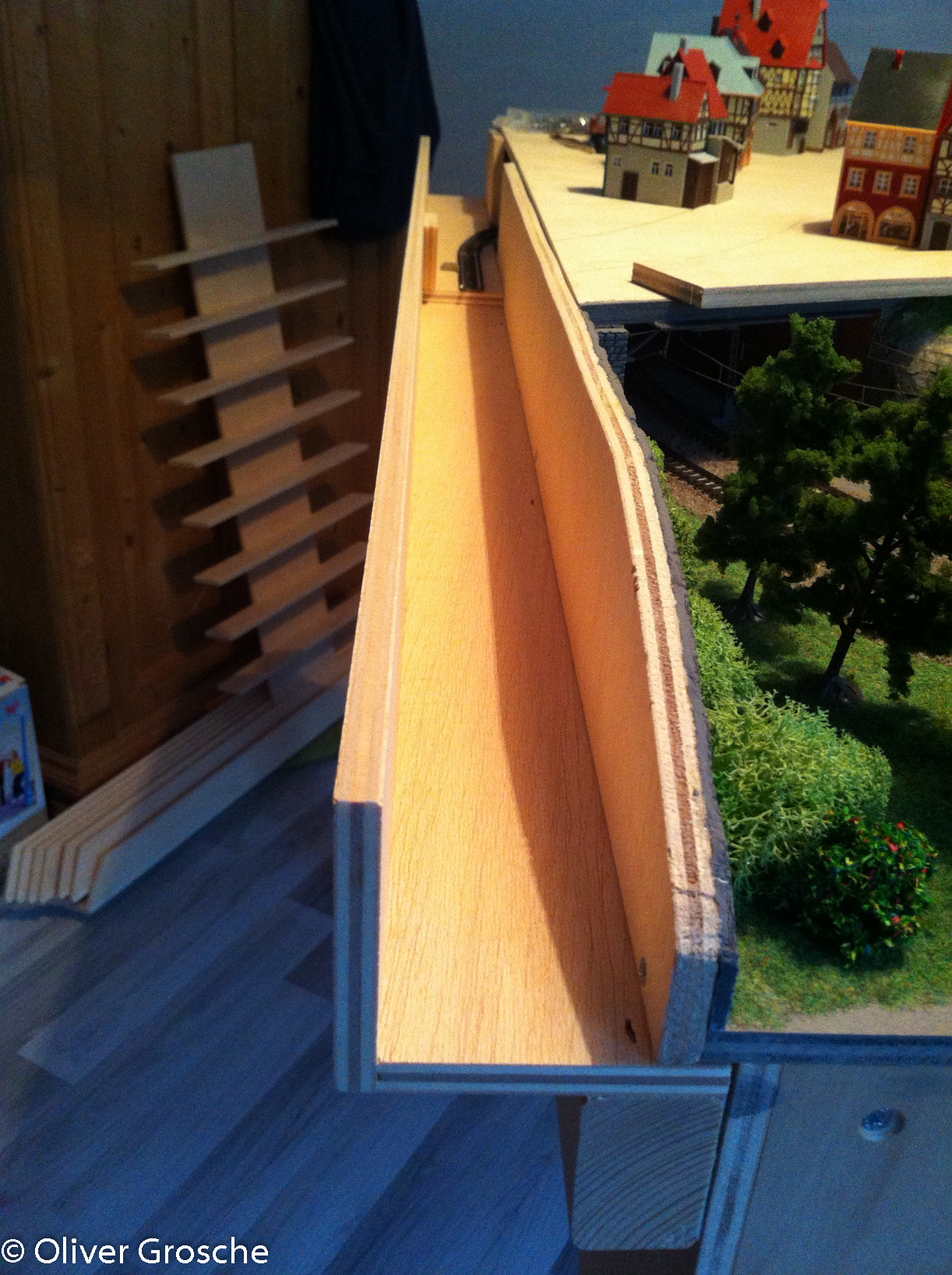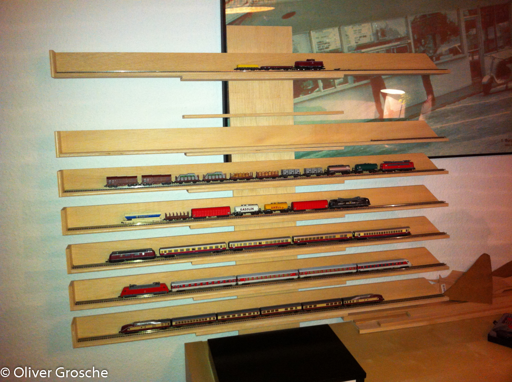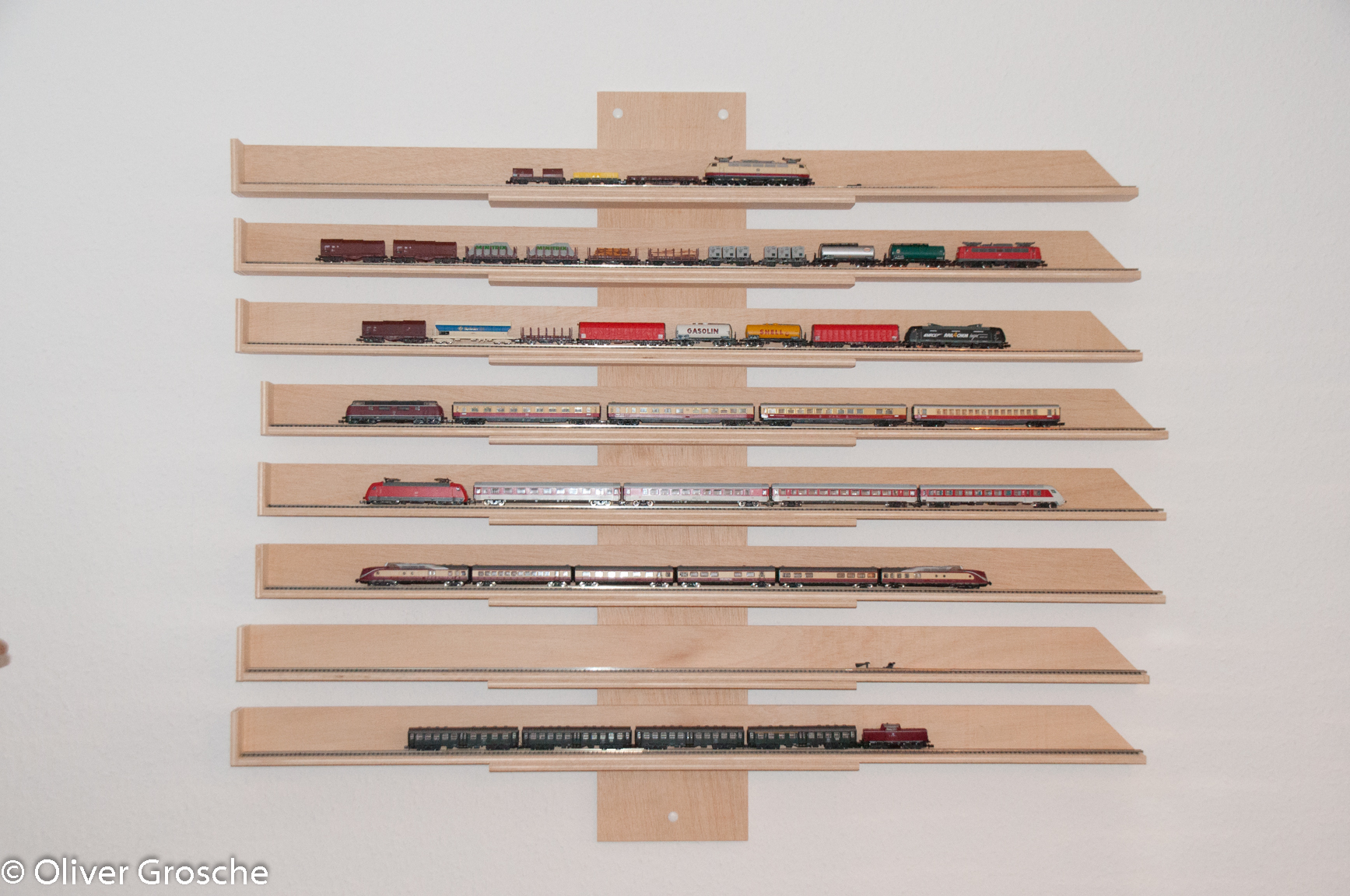 Auf einem meiner älteren Bilder konnte man ja im linken Anlagenbereich (im Tunnel) einen Abzweig erkennen, um die Anlage erweitern zu können. Dieser wurde nun mit einer Erweiterung in Betrieb genommen. Damit lassen sich nun die Züge von der Bahn im ganzen runterfahren und in einem eigens dazu gebauten Regal ablegen/verstauen.