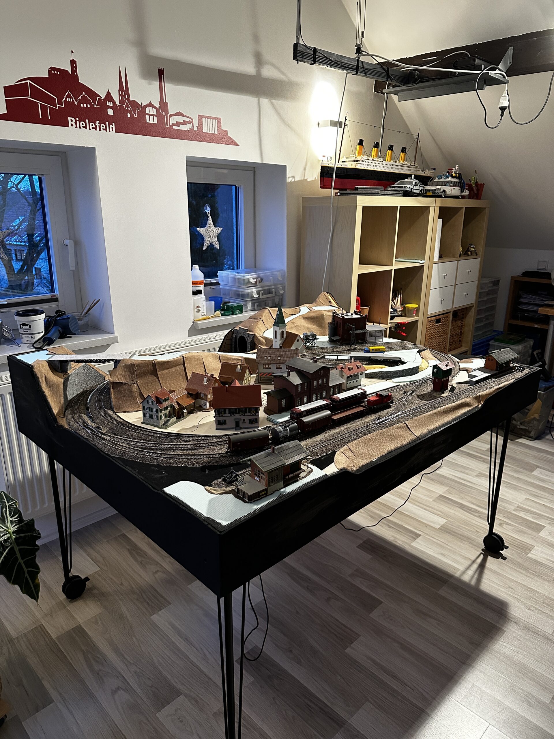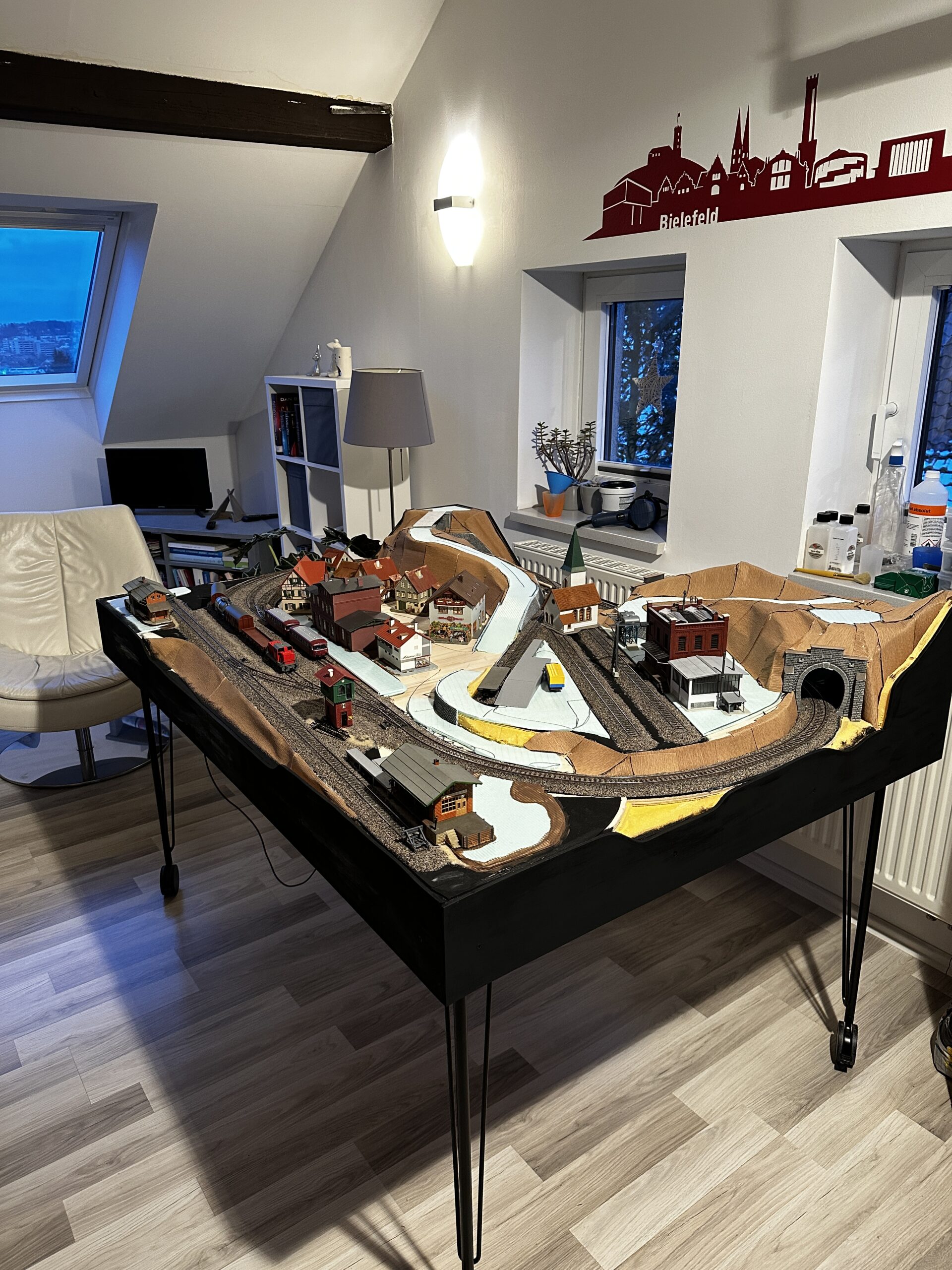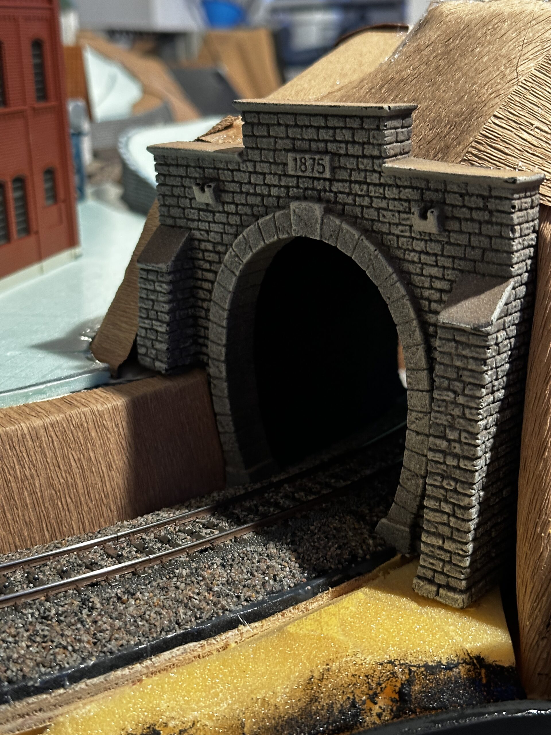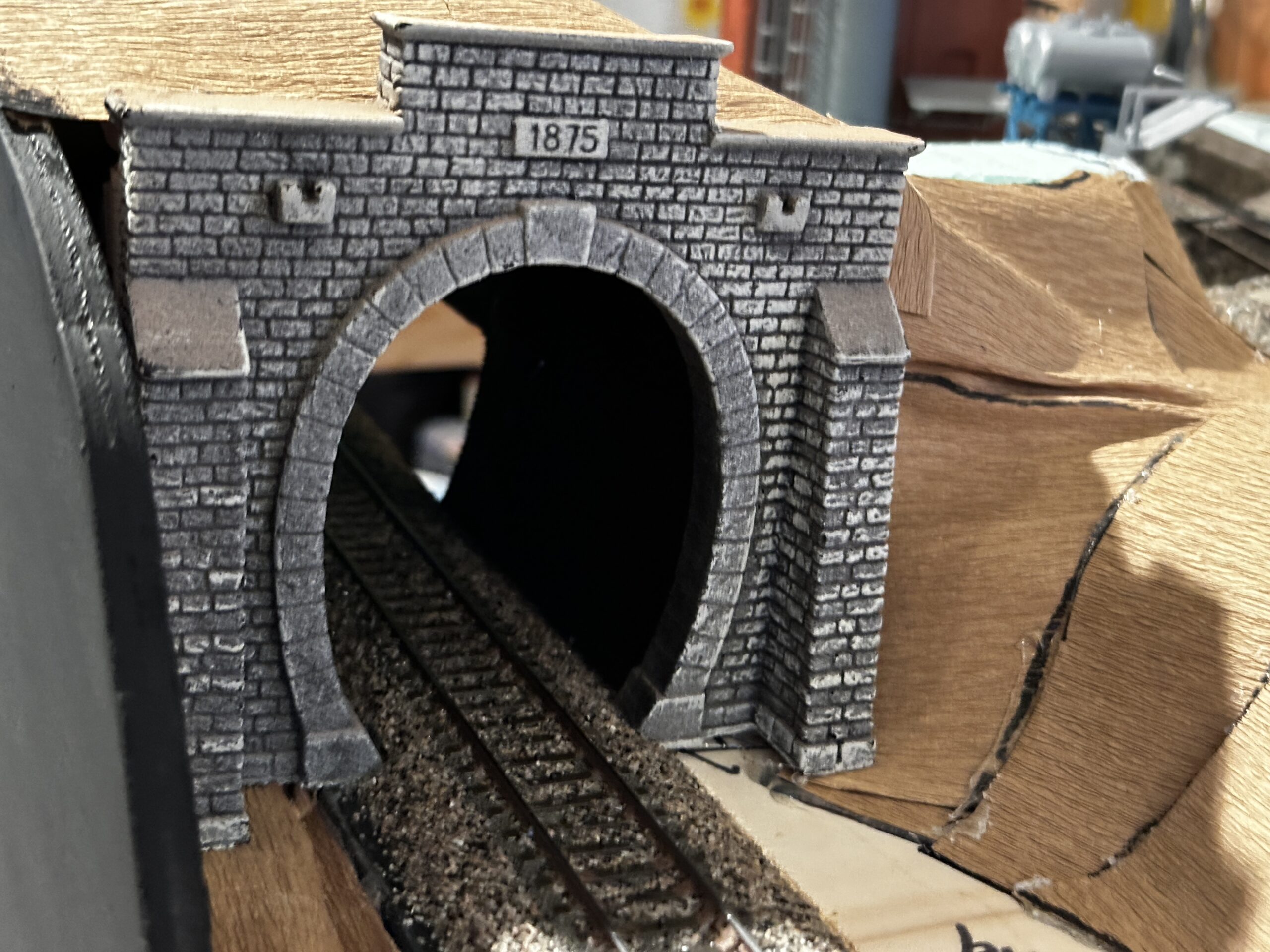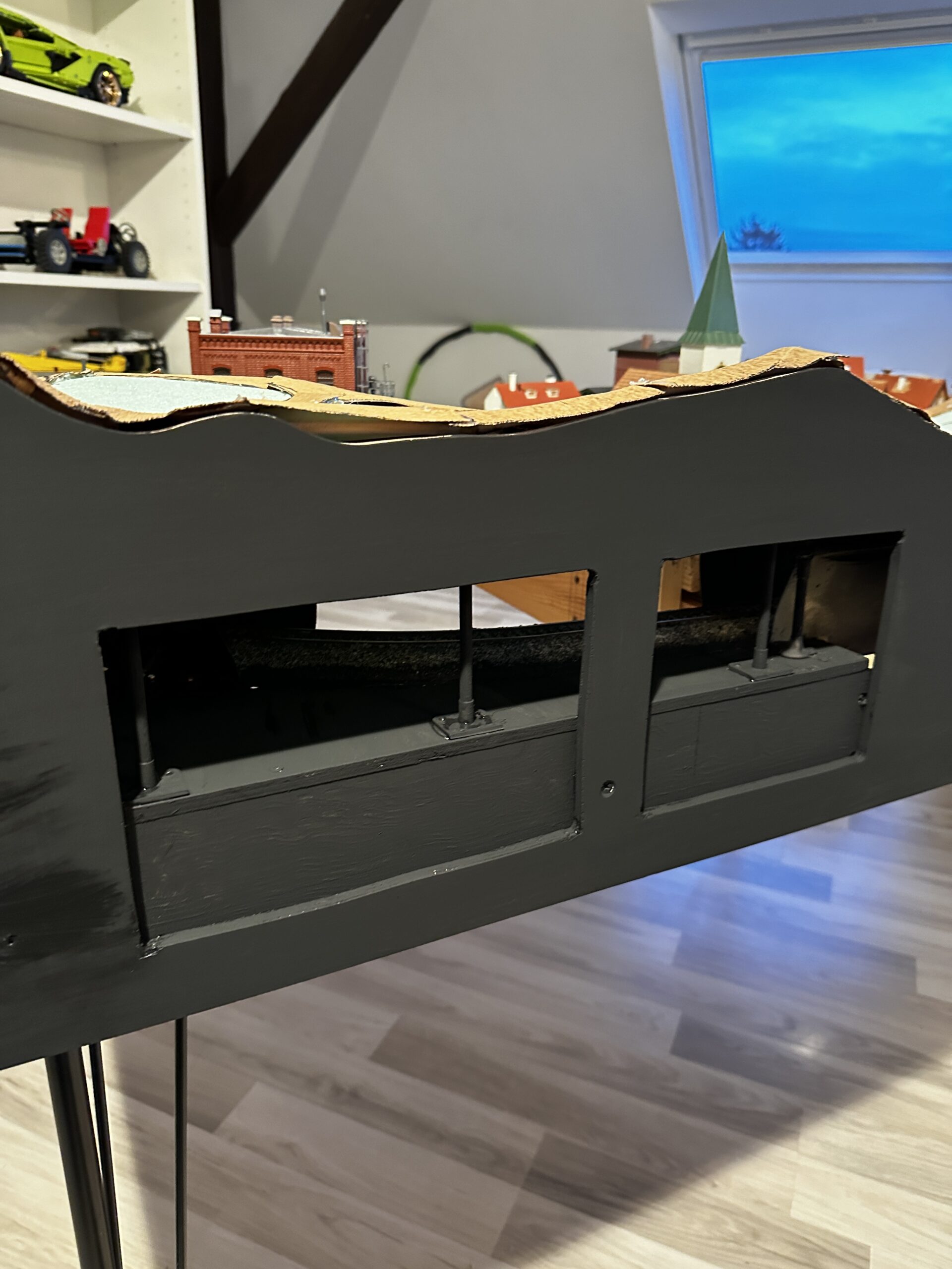 An diesem Tag gibt es nicht ganz so viel Fortschritt. Der Tunnel an hat den Einfahrten, für die ersten 10cm, Maueratrappen bekommen. Der restliche Innenraum des Tunnels wurde mit schwarzer Abtönfarbe gestrichen. Genauso erging es auch den Aussenblenden der Anlage, die auch mit schwarzer Abtönfarbe angestrichen wurden.