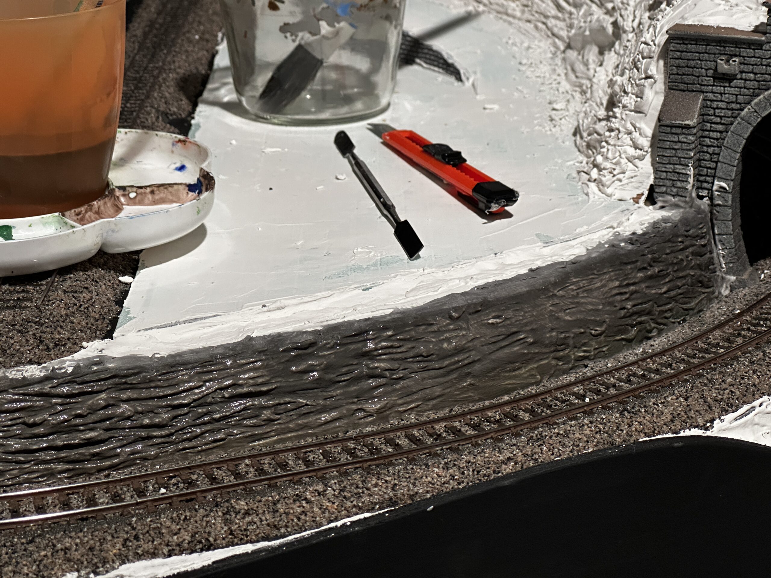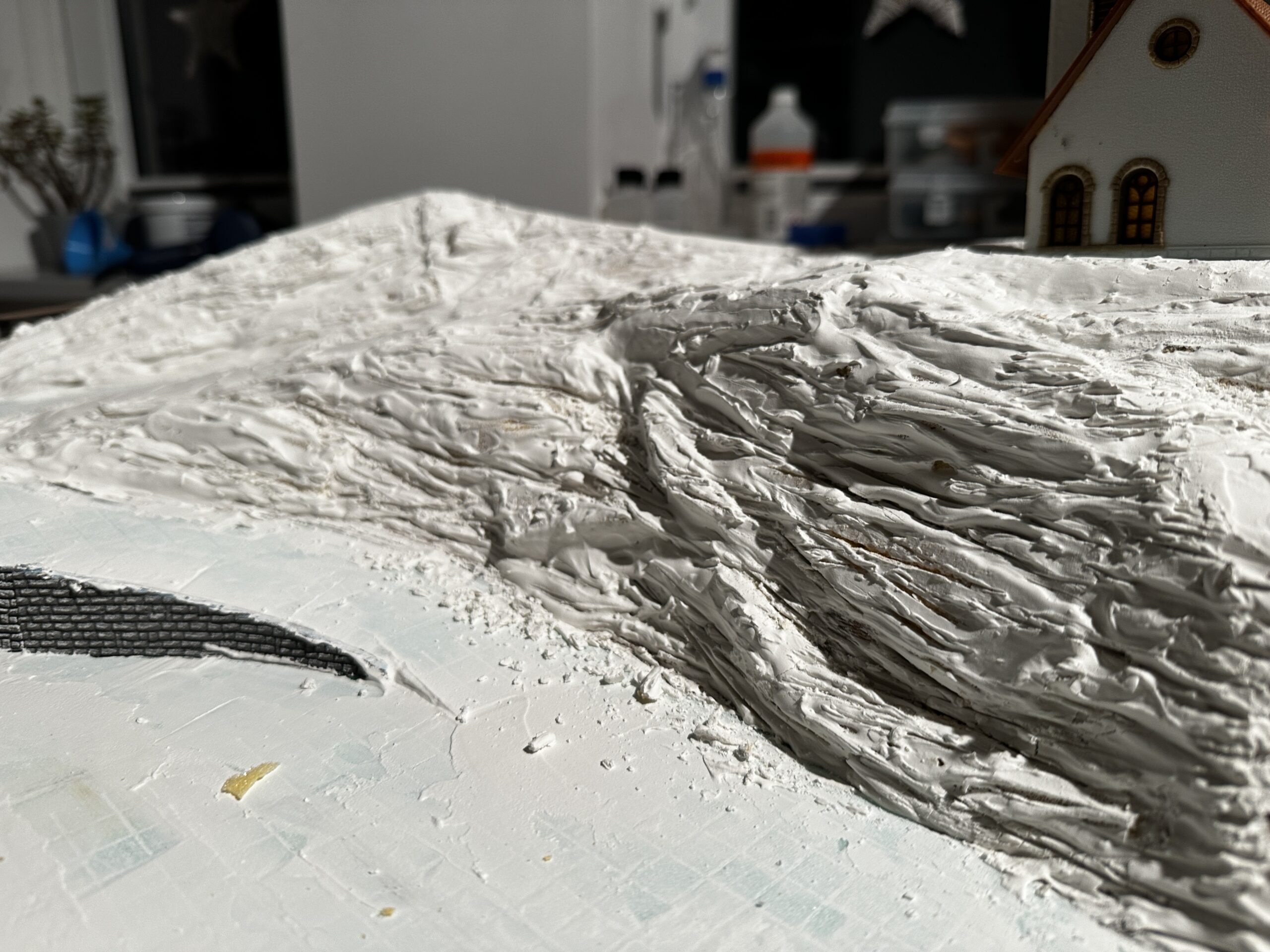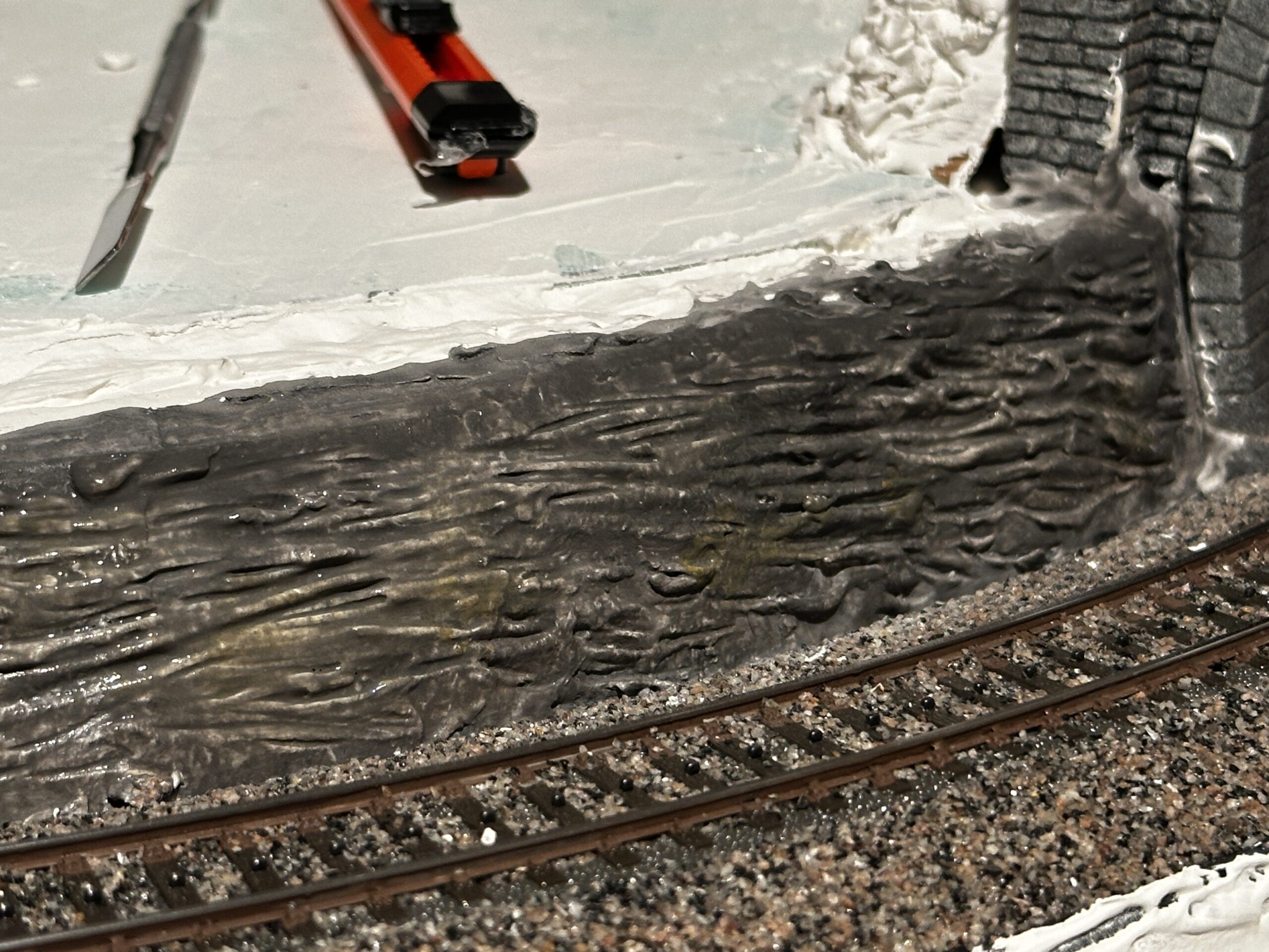 Bautag 38 Die Straßen wurden Farblich angepasst. Dazu wurde Acryl-Schwarz, -Weiß und Dreckwasser von vorhergehenden Bauschritten benutzt.
