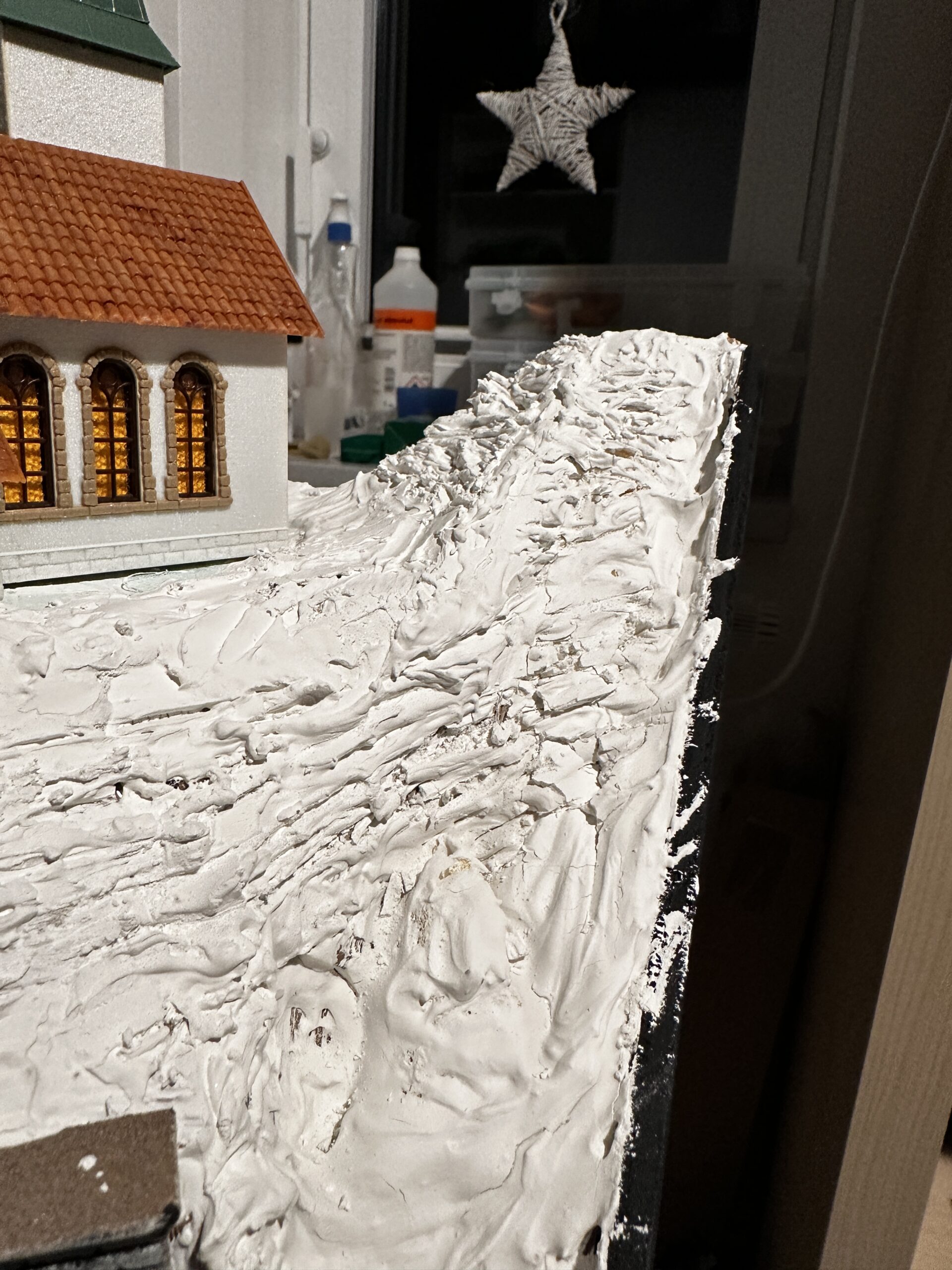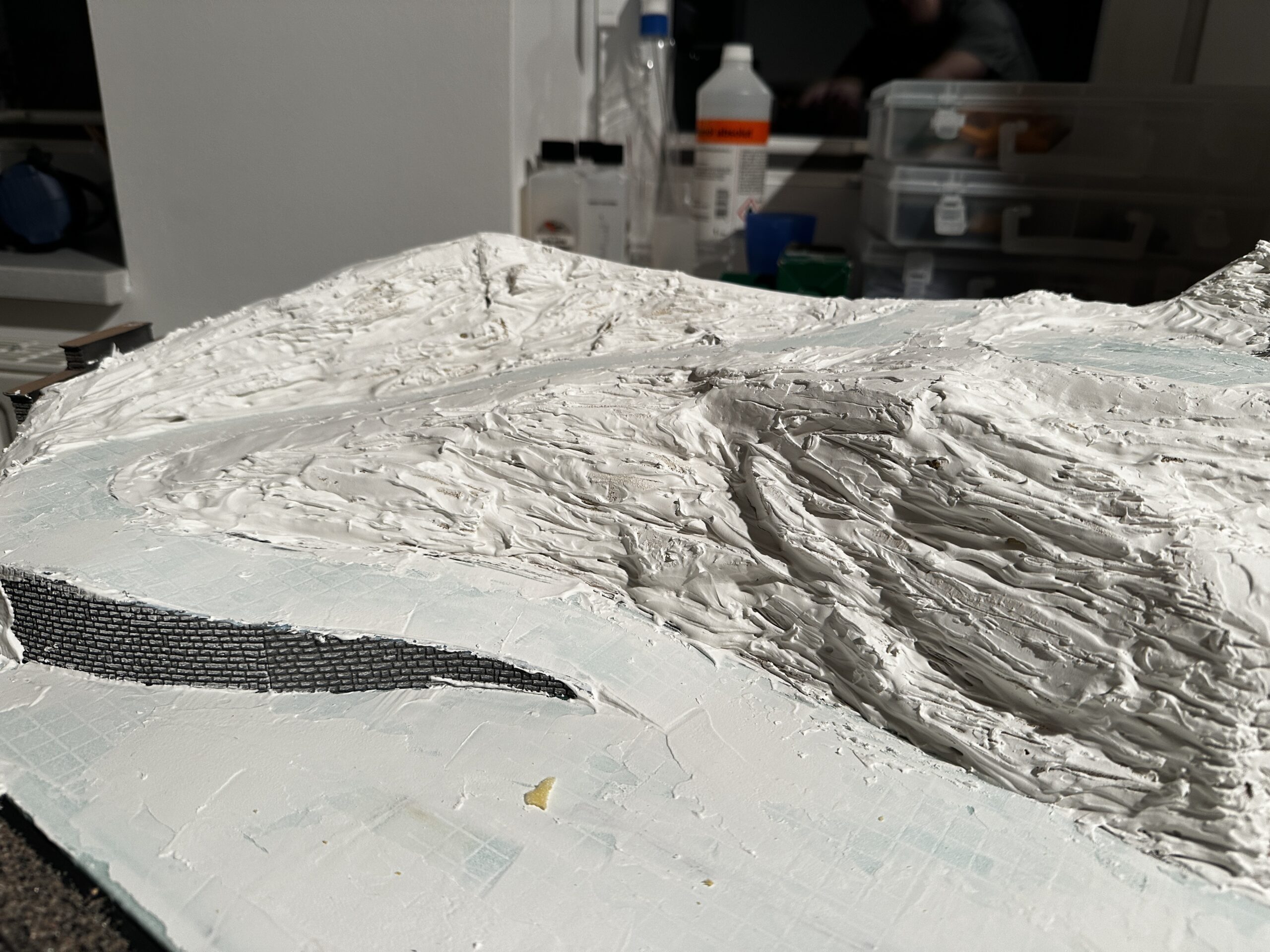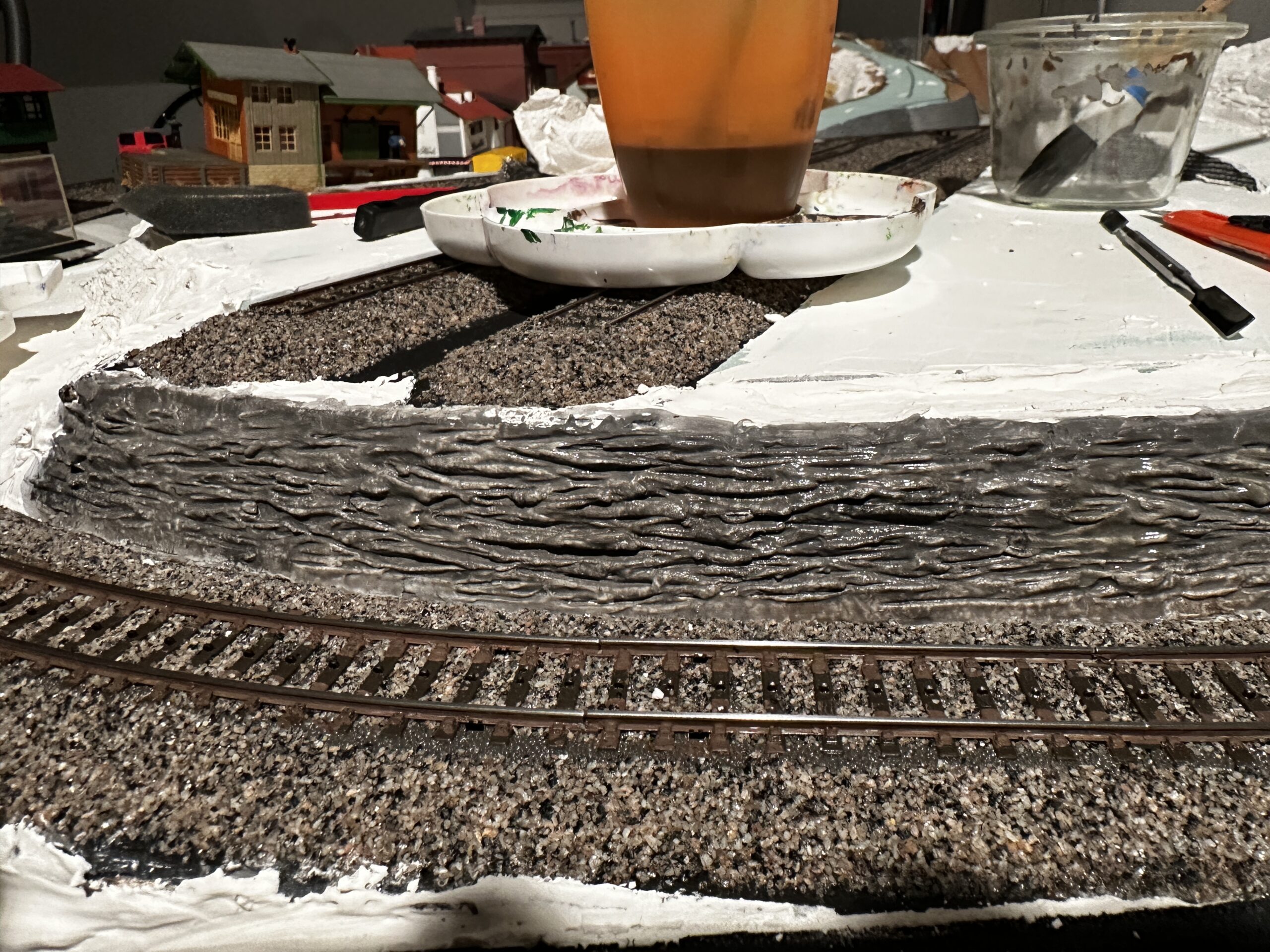 Bautag 38 Die Straßen wurden Farblich angepasst. Dazu wurde Acryl-Schwarz, -Weiß und Dreckwasser von vorhergehenden Bauschritten benutzt.