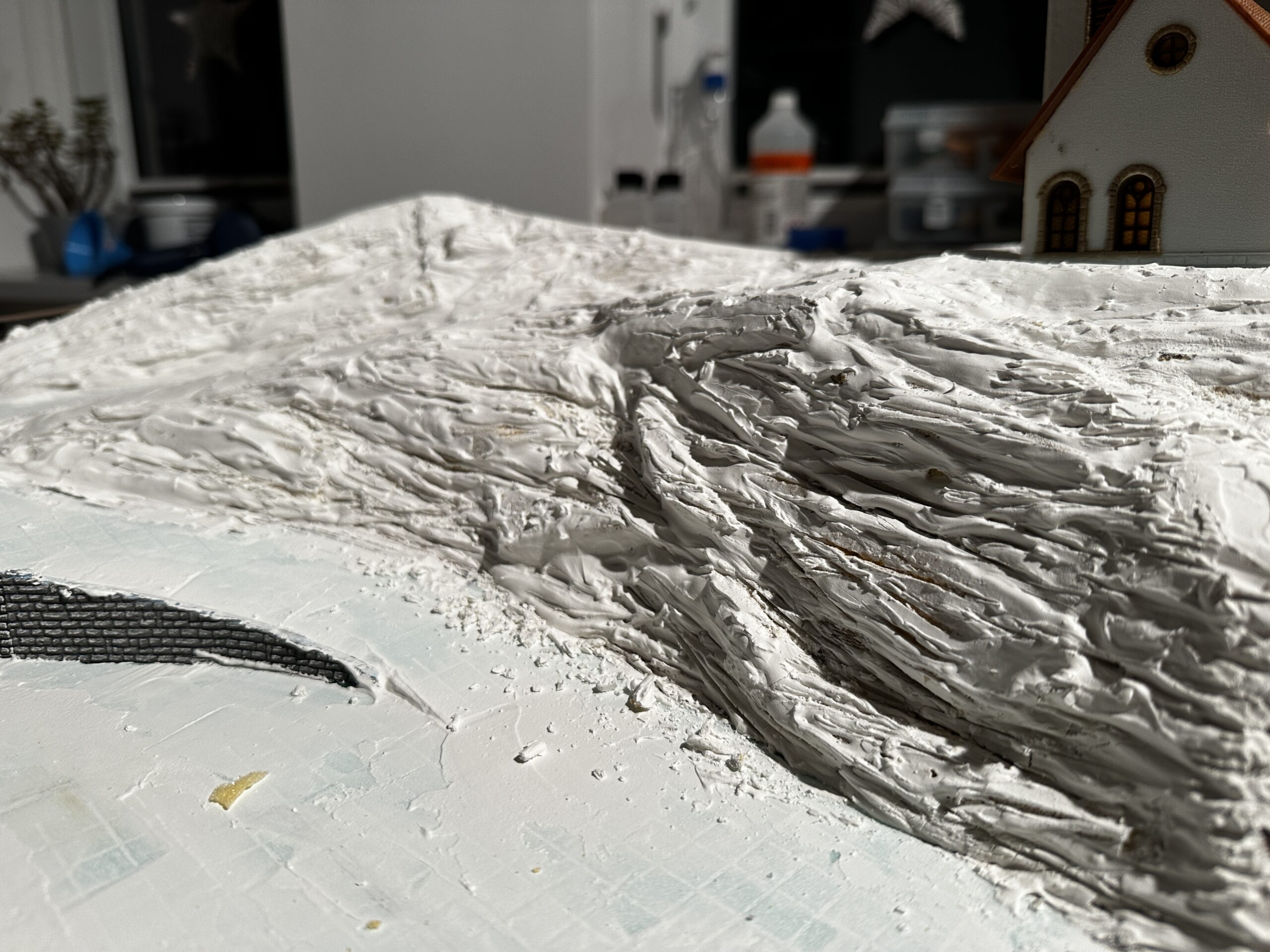 Bautag 25 Unten ist das Ergebnis von vorherigen Bautag zu sehen. Leider ist stellenweise die Spachtelmasse noch nicht fest, so das sie weiter trocknen muss. Deshalb wurde an zwei stellen, die schon fest waren, die Farbgebung mittels Wasserfarbe getestet.