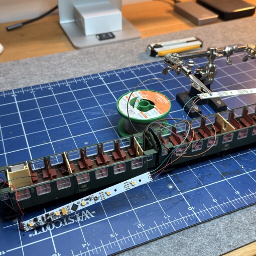 Heute wurden die Schienen angemalt, dazu habe ich mich an der Beschreibung von „MMC Moba TV“ orientiert. Als Farbe kam Abtönfarbe in Oxid-Braun zum Einsatz. Die Silikon-Pinsel (40mm & 60mm) habe ich bei Amazon gefunden. Nachdem alles getrocknet war, habe ich noch einen kleinen Schottertest gemacht.